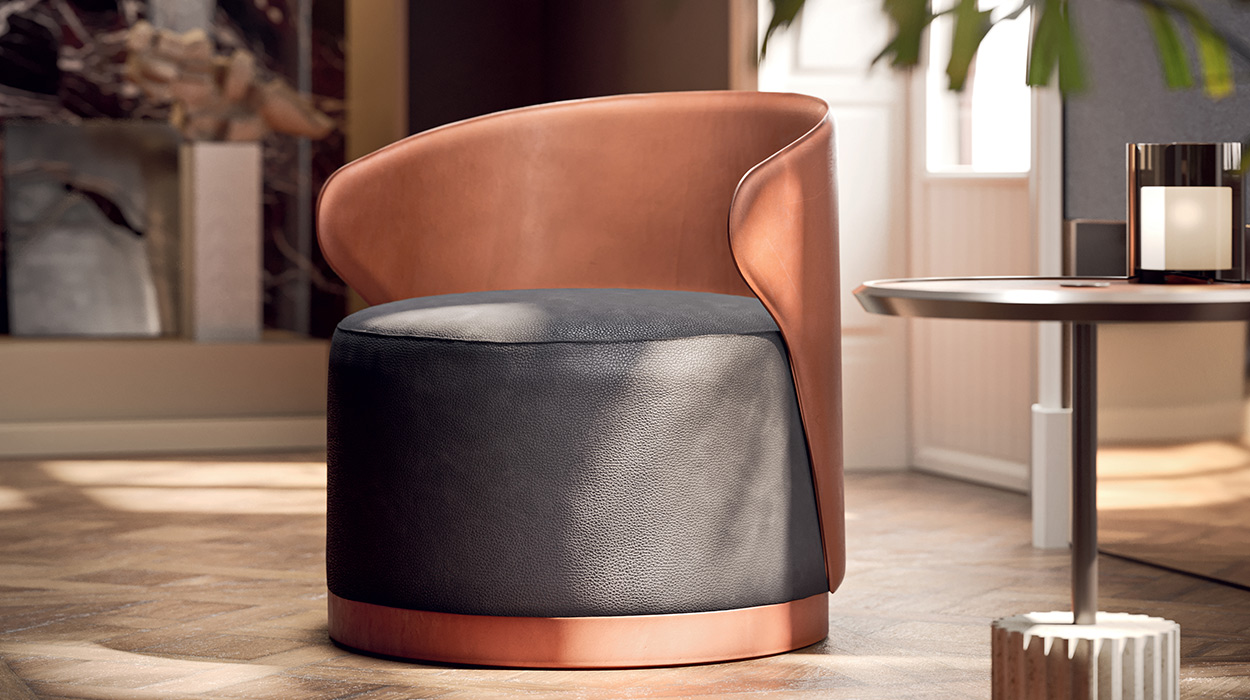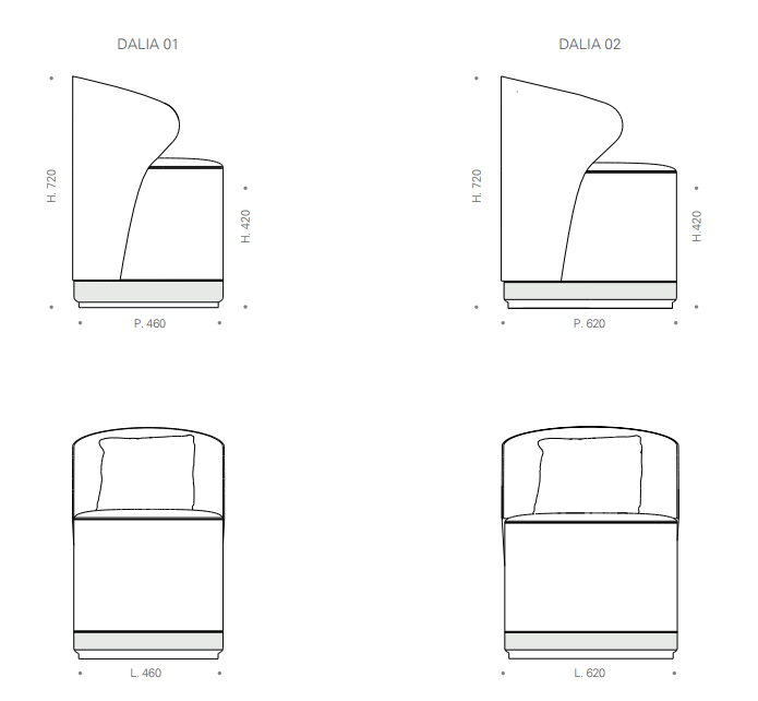 Кресло Dalia отличается элегантным и универсальным дизайном. Он характеризуется кожаной спинкой, которая также распространяется на нижнюю полосу, придавая изысканный и гармоничный вид. Спинка, тонкая, но прочная, имеет обволакивающую форму, которая обнимает сиденье, обеспечивая комфорт и поддержку. Это кресло идеально подходит для различных условий, от гостиной до гостиной, до спальной зоны, благодаря своей способности легко вписываться в любой жилой контекст.
