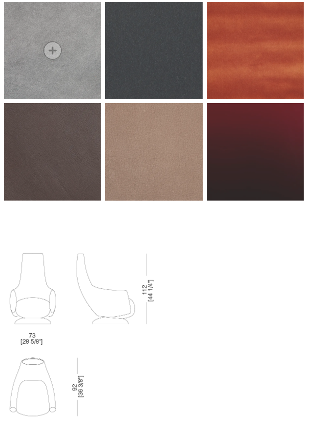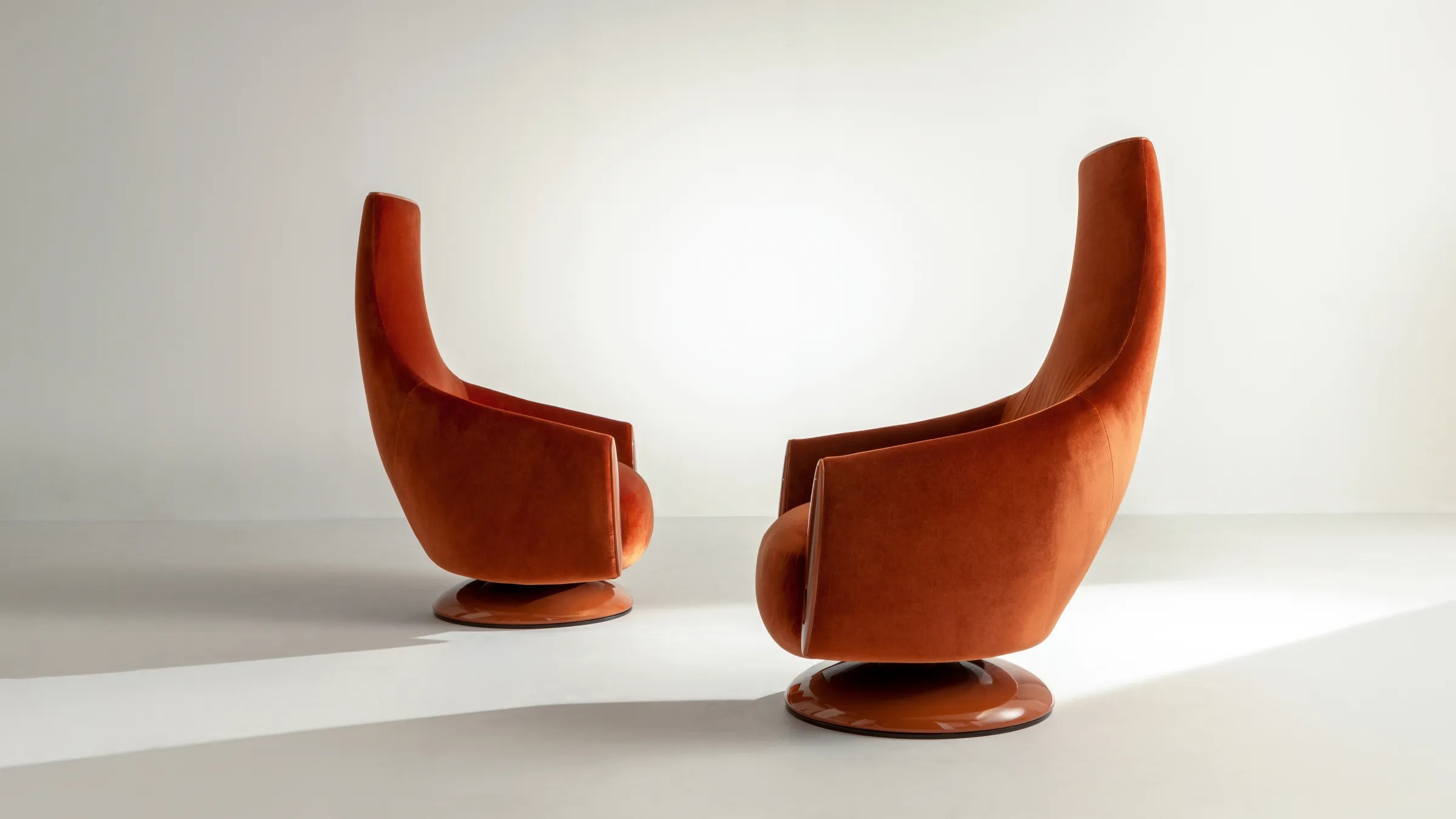 Кресло с поворотным основанием, отличающееся скульптурной и лаконичной формой, а также утончённым сочетанием материалов.