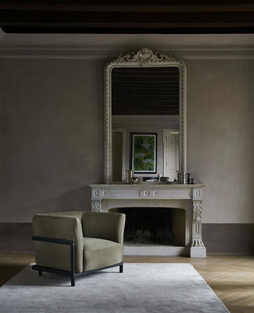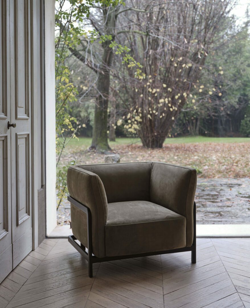 Кресло DOMINICK, спроектированное архитектором Энрико Чезаной, имеет обволакивающие и удобные формы. Конструкция выполнена из изогнутого и округлого массива дерева и полностью обволакивает кресло. Обивка выполнена из пенополиуретана и пены с эффектом памяти высокой плотности. Обивка доступна в различных вариантах из ткани или кожи.