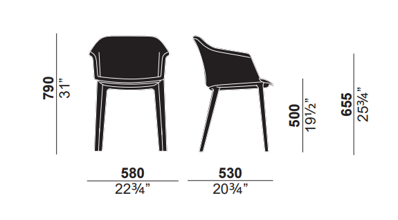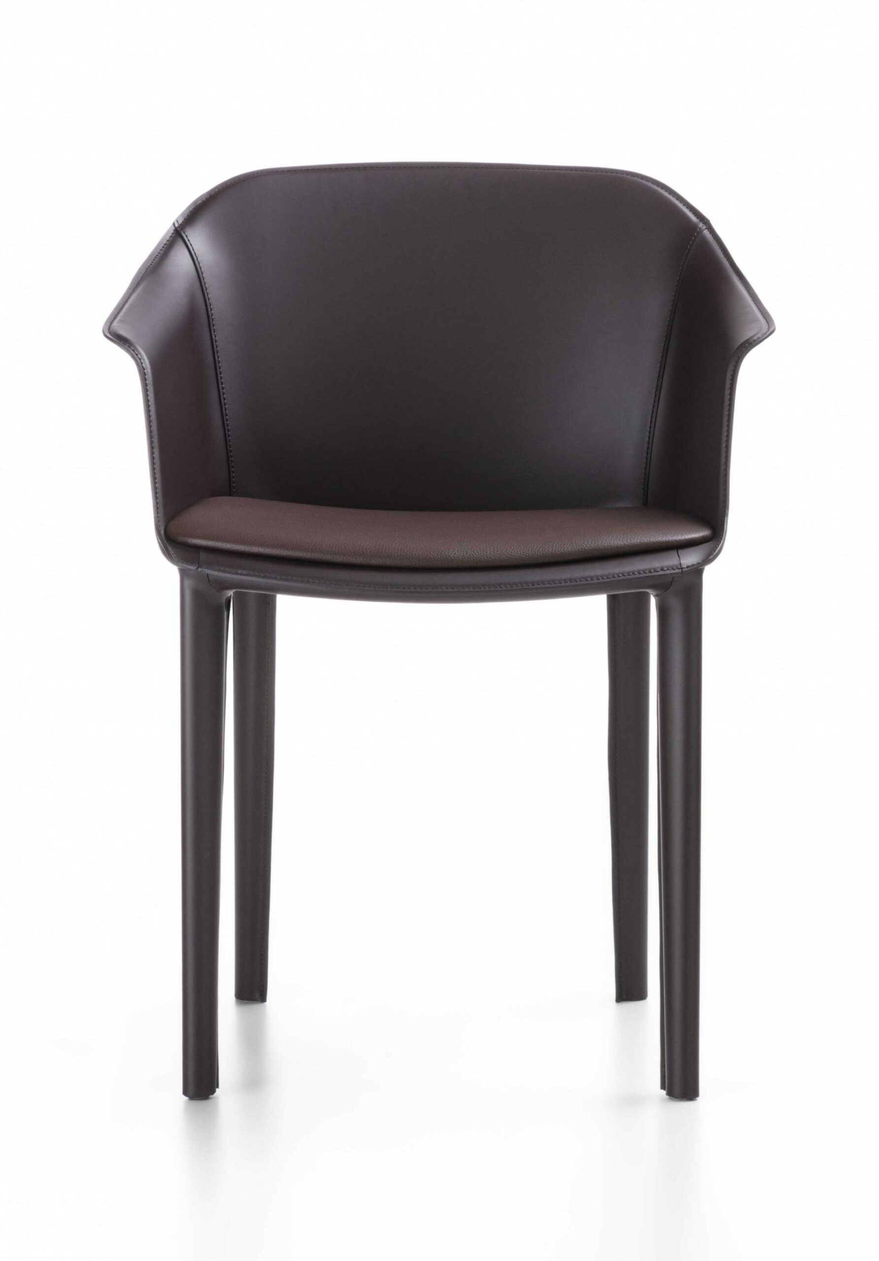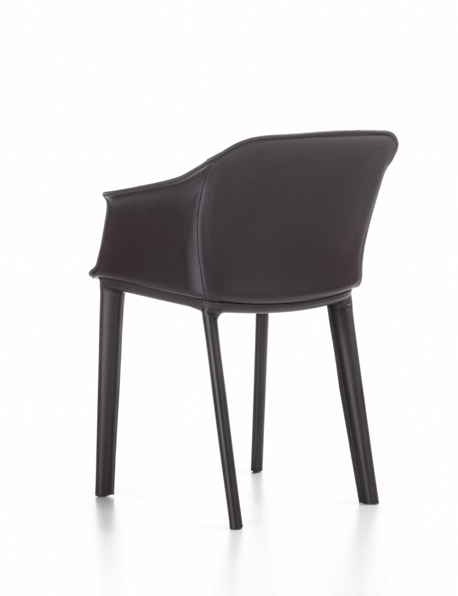 Кресло с жесткой полиуретановой обивкой доступно в кожаном исполнении со встроенной тонкой подушкой сиденья или с мягкой обивкой, покрытой мягкой кожей, войлоком, инновационным материалом или материалом, предоставленным заказчиком. Конструкция с 4 ножками, покрытыми тем же материалом, что и обивка.