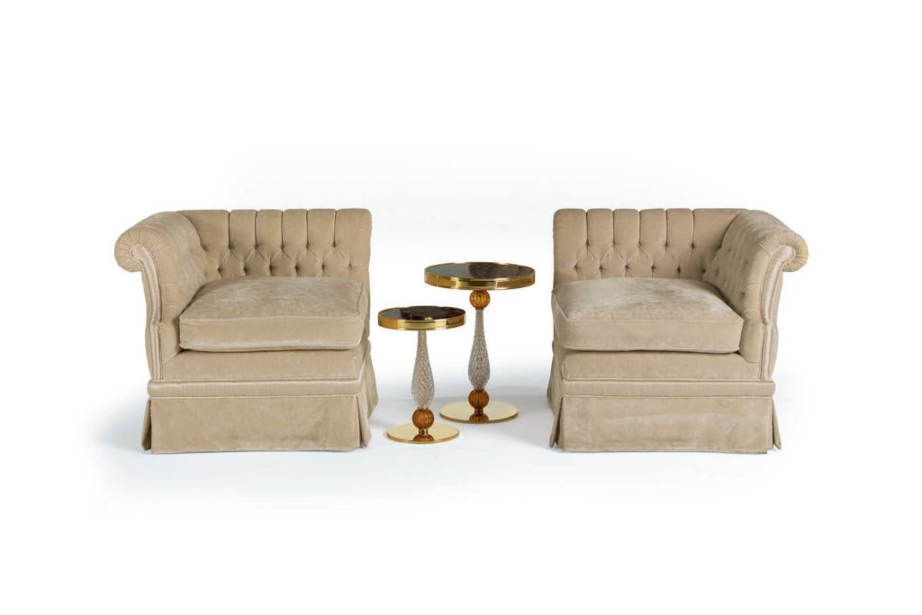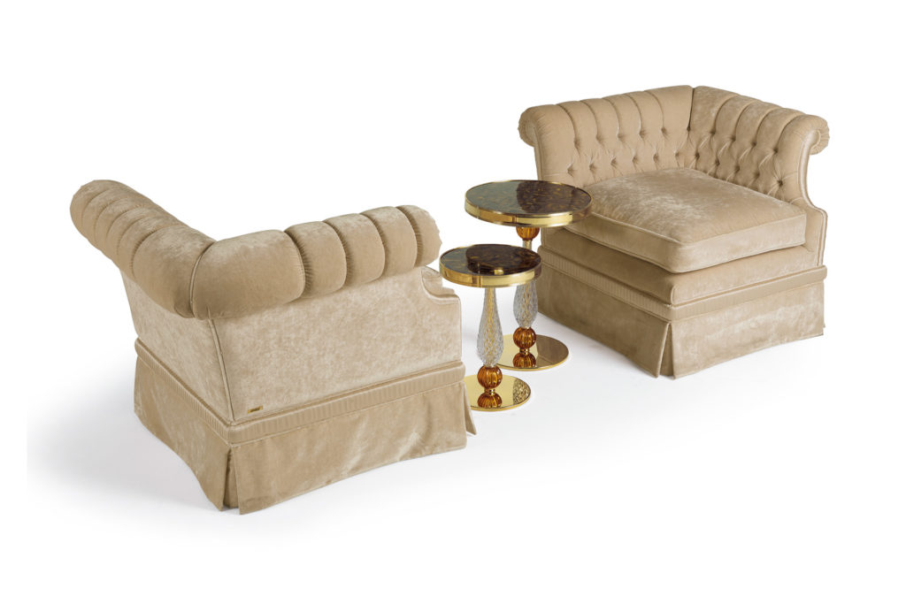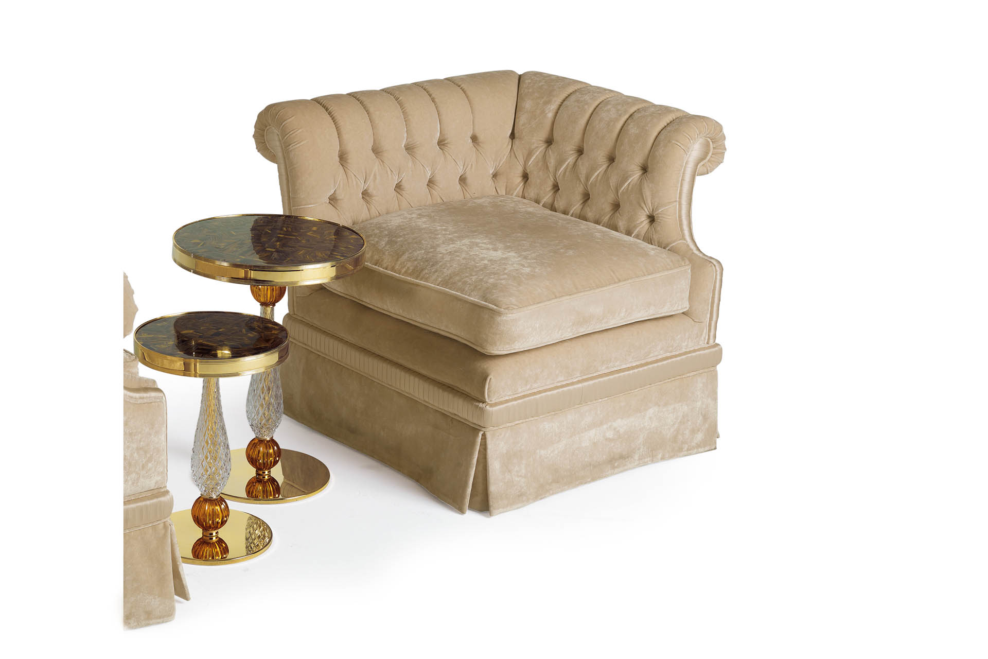 Угловое кресло в классическом стиле с обивкой в стиле capitonnè, выполненное по индивидуальному заказу, с объемными подлокотниками с завитками