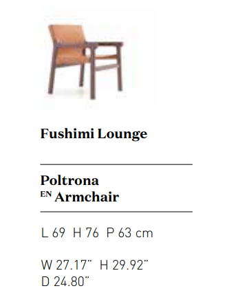 Итальянское мастерство сочетается с японским стилем в кресле, наполненном различными отсылками и тактильными ощущениями. Коллекция Fushimi пополнилась новым дополнением. Благодаря касательной взаимосвязи между соединениями возникает ощущение ожидания. Кожа обволакивает дерево, обновляя древнюю традицию сотрудничества: создавая новые взаимоотношения между материалом и цветом. Кресло Fushimi lounge, представляющее собой новую интерпретацию кровати Fushimi, опирается на основные черты своего собственного стиля, начиная с обработки и отделки роскошного массива дерева. Спроектированное с учетом простоты, естественности и пропорциональности, кресло Fushimi Lounge имеет деревянную конструкцию, которая одновременно скрыта и выставлена напоказ в симбиозе с основной кожаной секцией, скрупулезное мастерство исполнения которой привлекает внимание.
