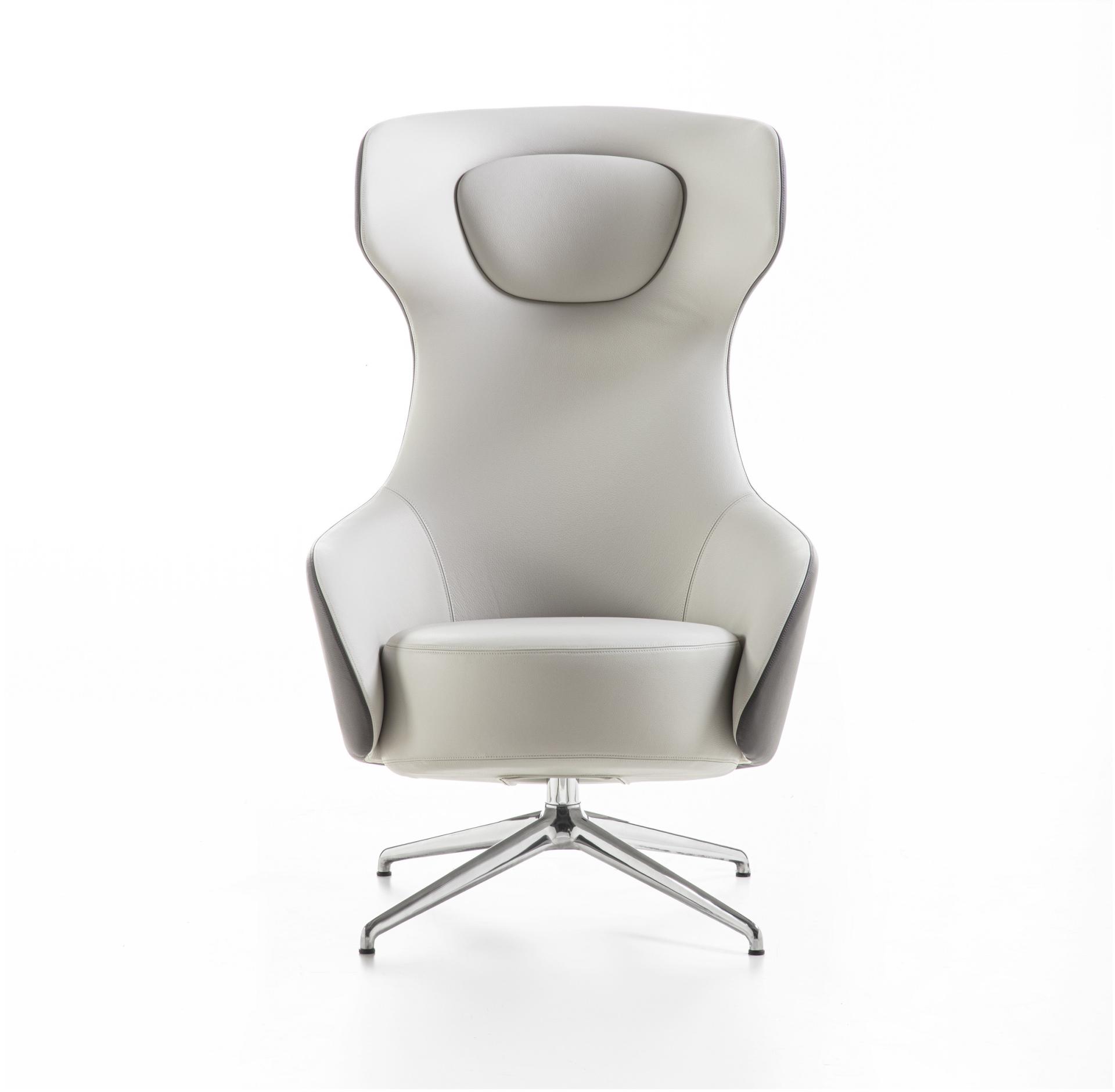 Кресло для отдыха со спинкой из пенопласта, металлическим каркасом, встроенной подушкой подголовника и 4-звездочным основанием.