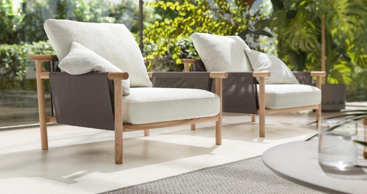 Диваны разных размеров, кресла и шезлонги для гостиной, столы и стулья для столовой создают полную коллекцию, подходящую для любого наружного пространства. Деревянная рама с сетчатыми вставками приветствует мягкие подушки сидений и спинки, в сочетании текстурной отделки и изысканных цветов.