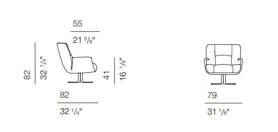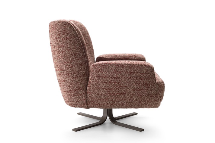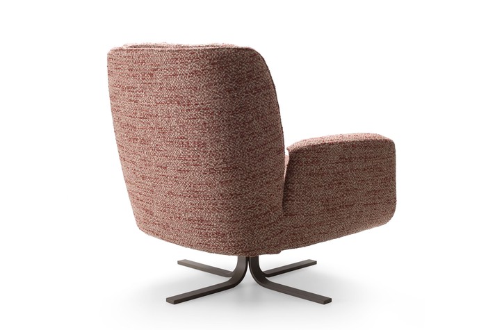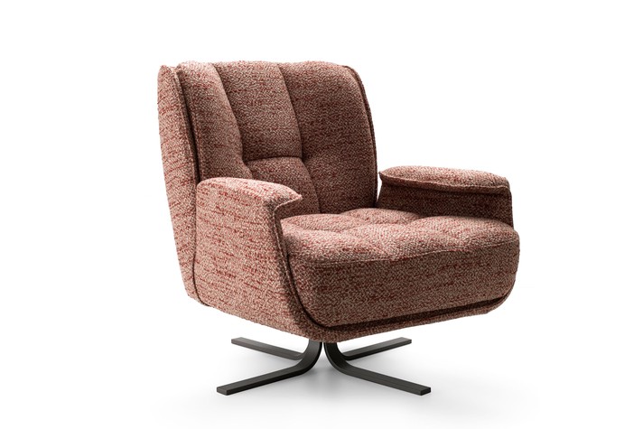 Современное вращающееся кресло со стеганым съемным чехлом из ткани, бархата или кожи, изогнутыми подлокотниками, центральным основанием со спицами и просторной подушкой сиденья и спинкой. Идеально подходит для уголка для чтения.