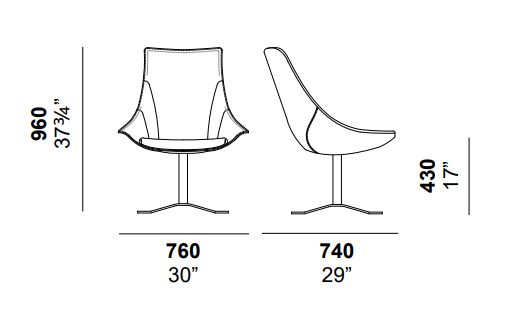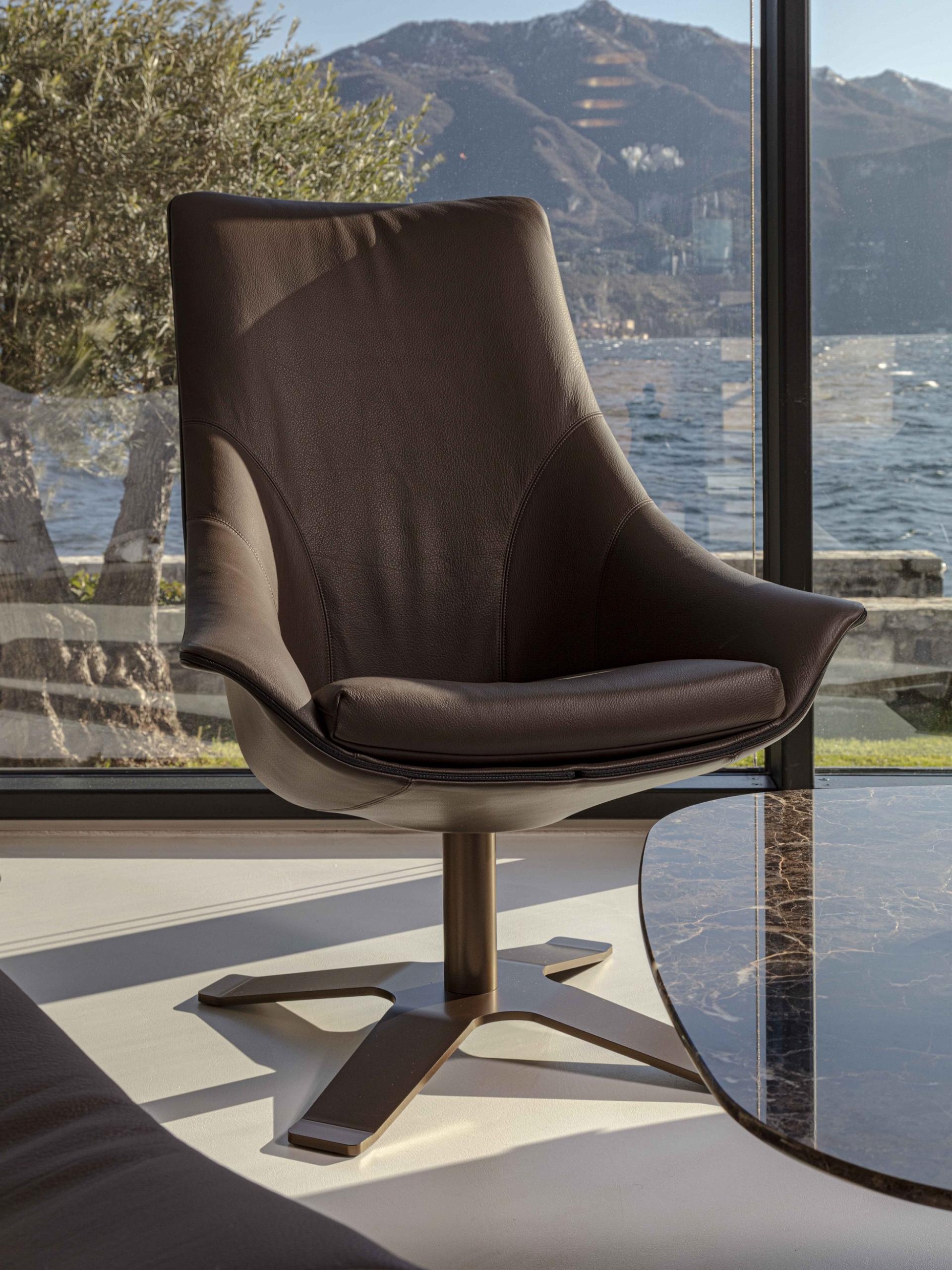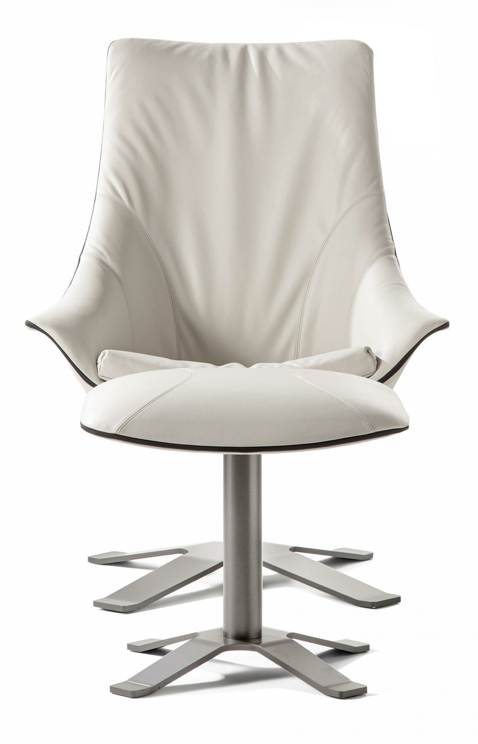 Кресло с высокой спинкой и жестким корпусом из полиуретана, обтянутым кожей. Поясничная опора в дополнение к подушке. Фиксированное лакированное основание X-образной формы.