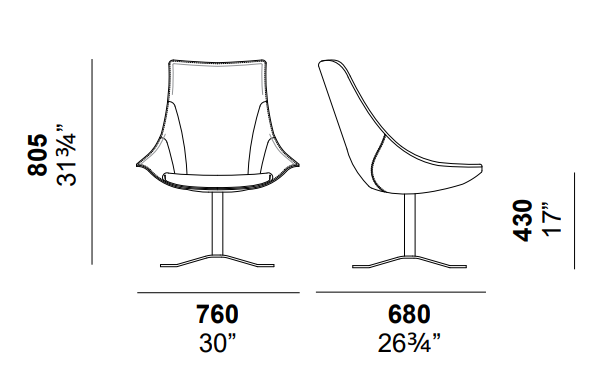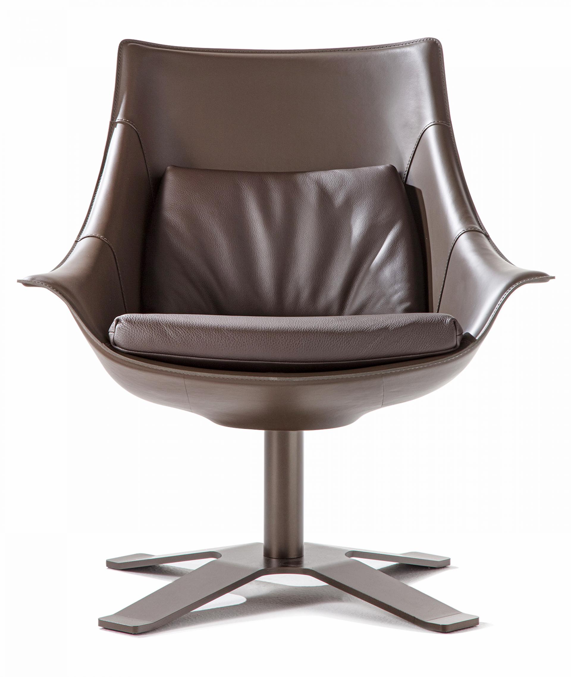 Кресло с жесткой полиуретановой обивкой, обтянутое кожей. Поясничная опора в дополнение к подушке. Фиксированное лакированное основание X-образной формы.