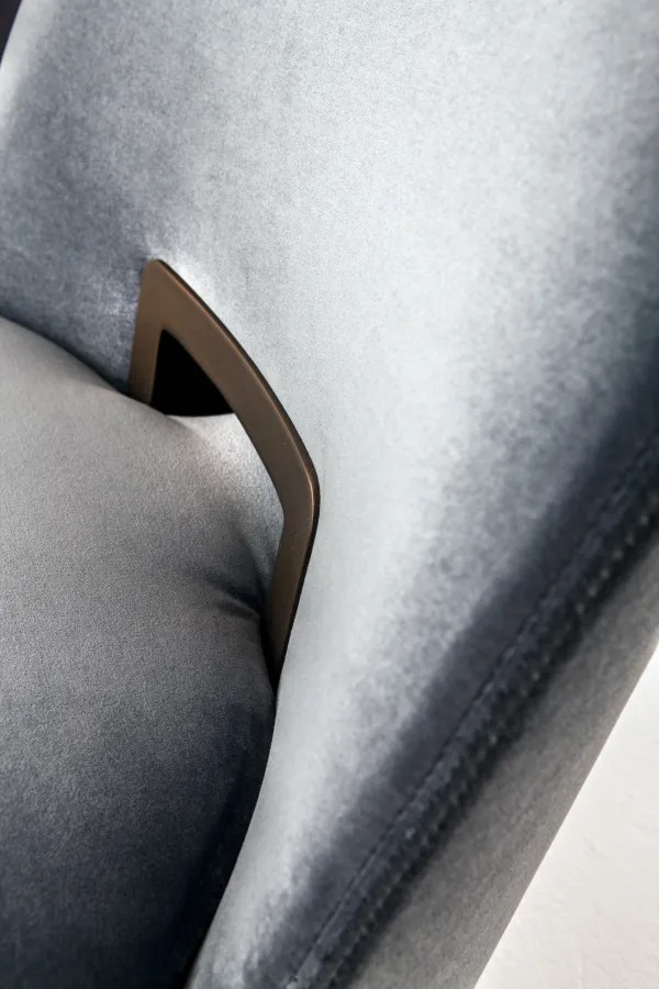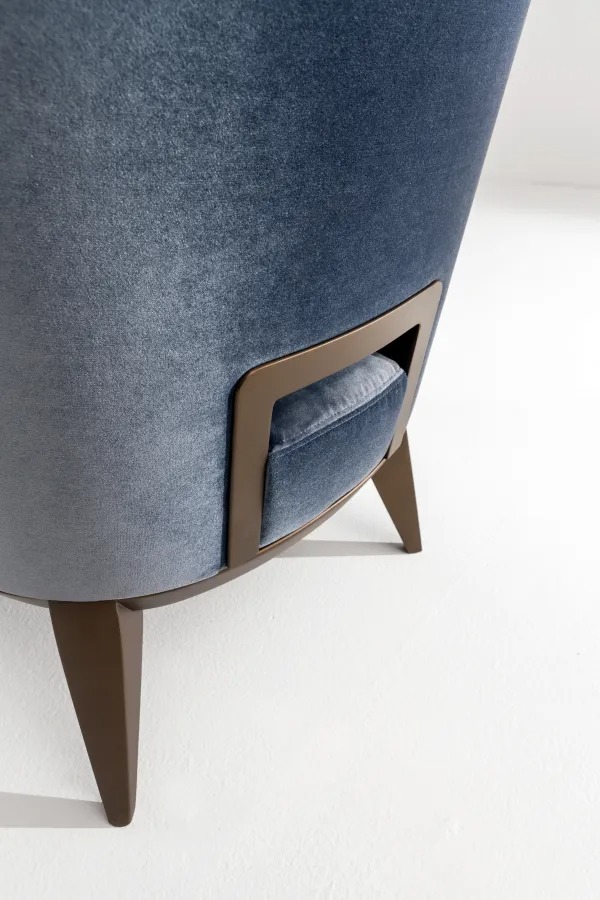 Кресло с обтянутой кожей, бархатом или тканью и деревянной рамой, с сиденьем из полиуретановой пены.