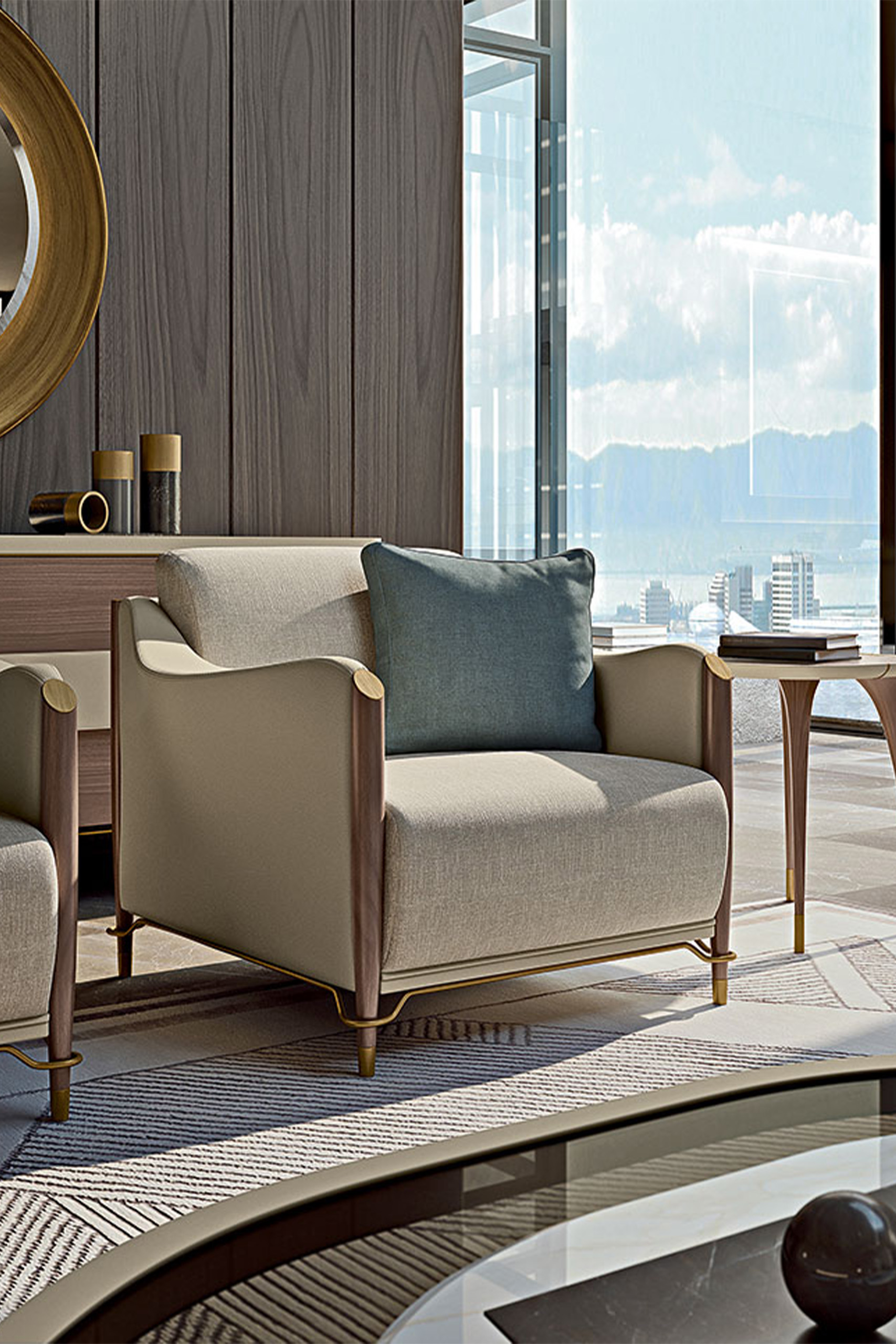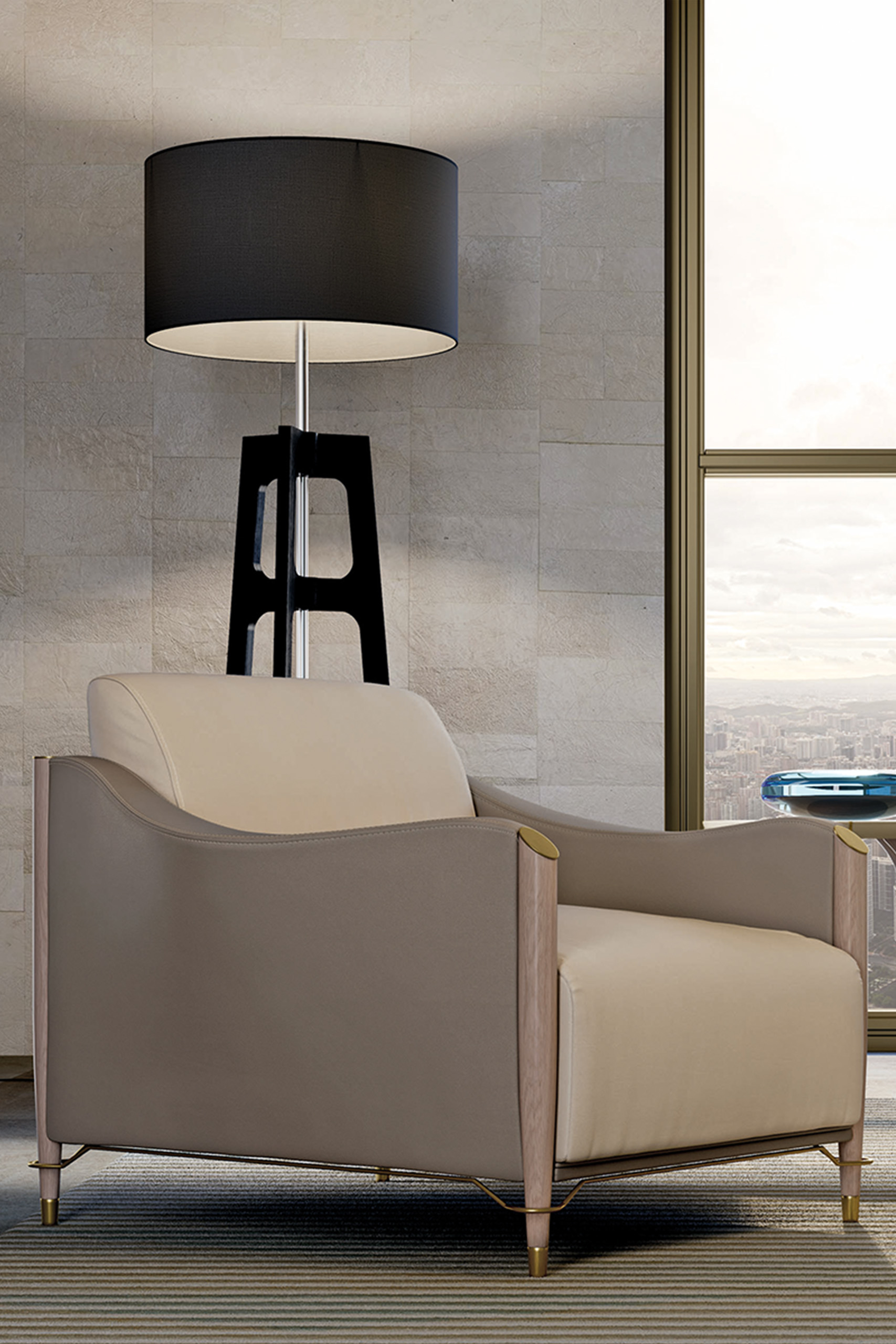 Коллекция Melting Light — это визитная карточка TURRI, воплощающая космополитичный дух итальянского дизайна. Кресло привлекает внимание плавными, почти скульптурными линиями, которые создают эффект «таящего света» — отсюда и название. Подлокотники, выступающие наружу, не только добавляют комфорта, но и придают модели динамичный, современный силуэт. Детали из матового золотистого металла добавляют нотку благородства, делая этот предмет мебели истинным украшением интерьера.
