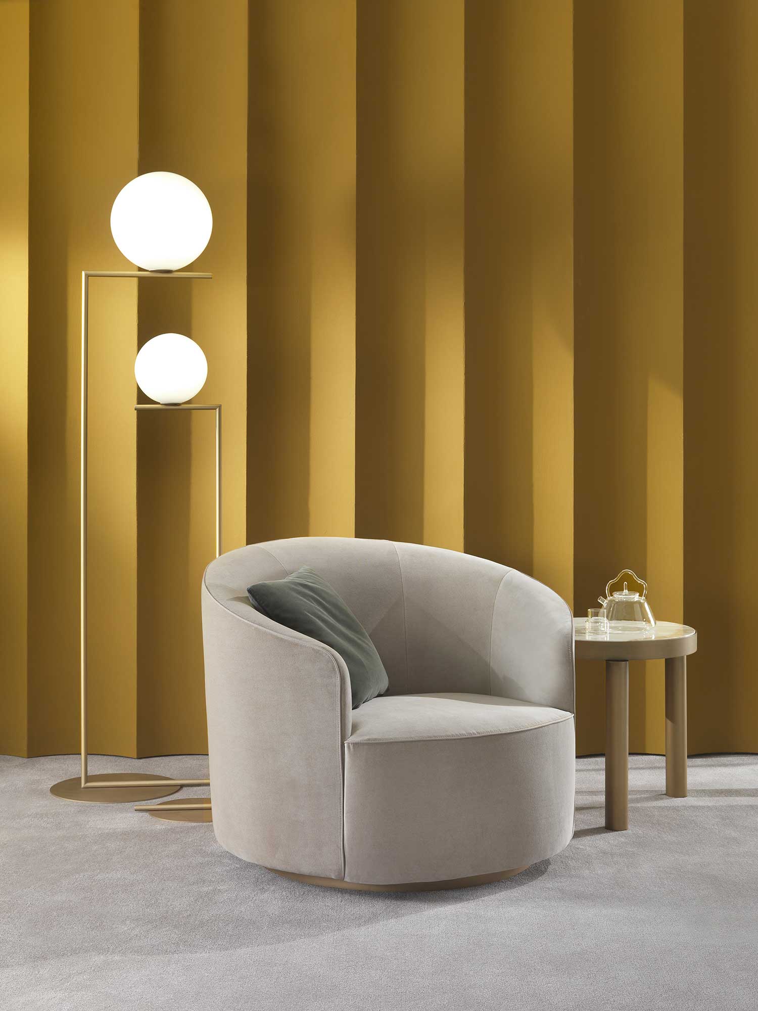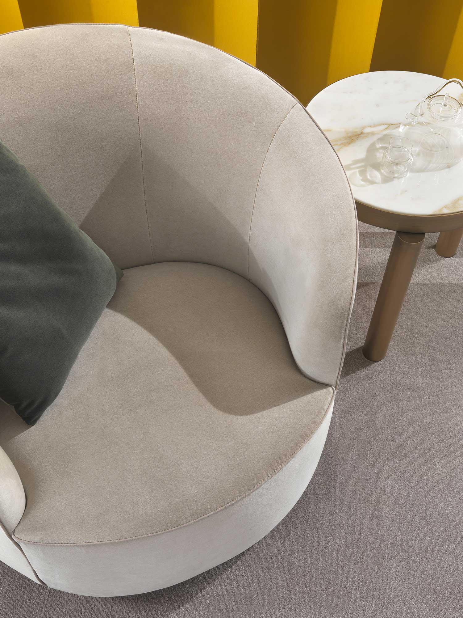 Коллекция Moon отличается утонченной эстетикой, где плавные изгибы спинки и сиденья создают ощущение воздушности, а легкое металлическое основание придает конструкции визуальную легкость. Дизайнеры Giulio Marelli добились идеального баланса между компактностью и комфортом, сделав кресло универсальным для гостиных, кабинетов и даже просторных спален.