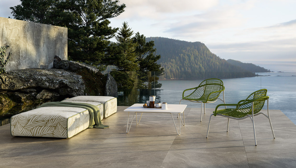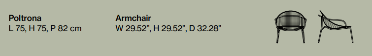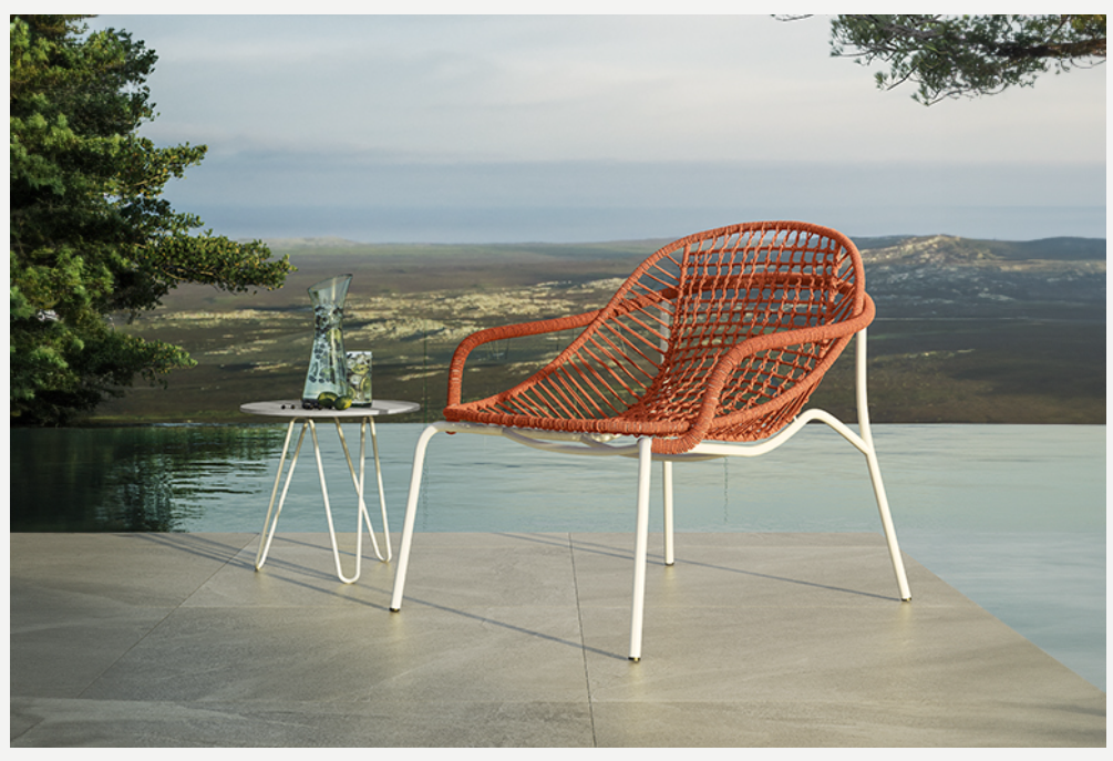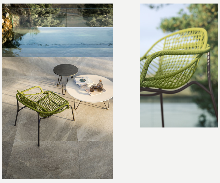 Дизайн, в котором воплощены опыт и мастерство, излучает красоту, умело сочетая традиции и современный стиль жизни. Сиденье полностью изготовлено из цветного каната ручной работы. Конструкция плетения представляет собой широкую центральную секцию в клетку с отдельными нитями, обвивающими стальной каркас сбоку. Таким образом, все тело поддерживается и плотно прилегает в любом положении. Чтобы передать тактильные и эстетические ощущения от сиденья, подлокотники из трубчатой стали также обмотаны веревками, а остальная часть конструкции выполнена из окрашенной стальной трубы в оттенки эспрессо или Сета. Ножки плавно выдвигаются наружу, что придает креслу Nuvola максимальную устойчивость.