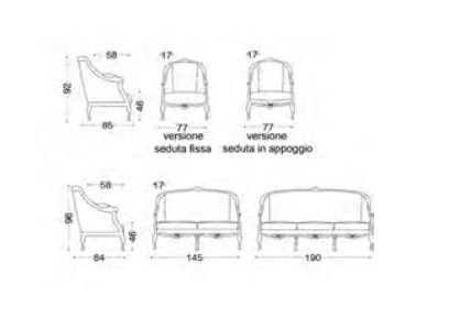 Варианты: кресло, 2-местный диван и 3-местный. Структура: дерево и его производные, перекрестные эластичные ремни высокая прочность. Набивка: пенополиуретан с различными размерами и качеством, полиэфирные волокна. По запросу, это можно настроить набивку подушек сидений. Особенности: отделка деревянной рамы a vista доступен в цветах, предусмотренных в каталоге. Кресло доступно с фиксированной подушкой сиденья, как на фото, или