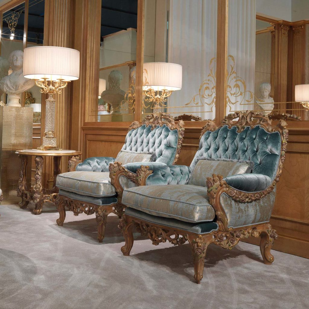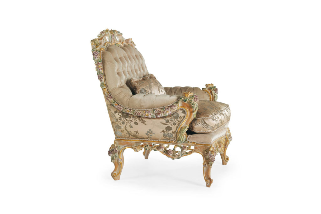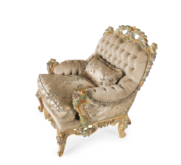 Кресло в классическом стиле рококо с чудесной резьбой, усиленной золотой отделкой с красочными деталями.