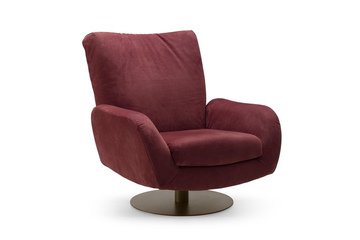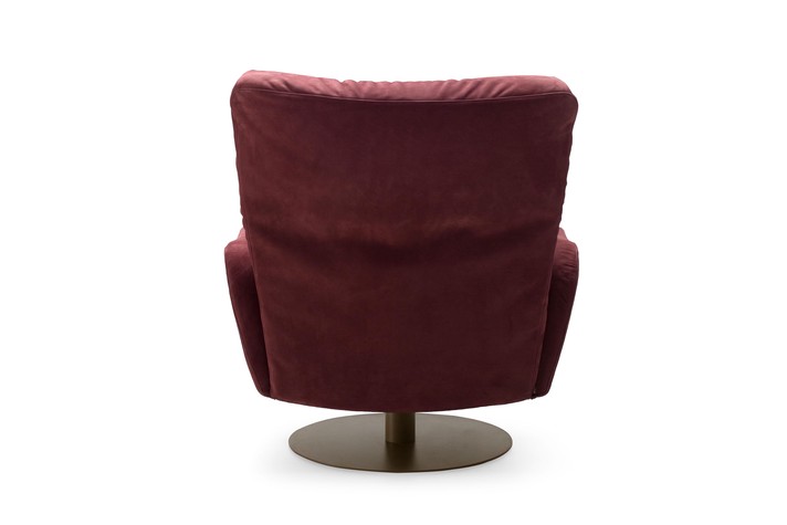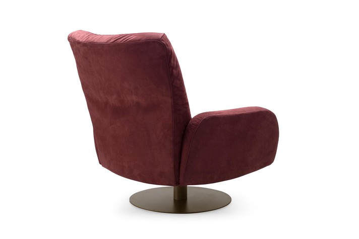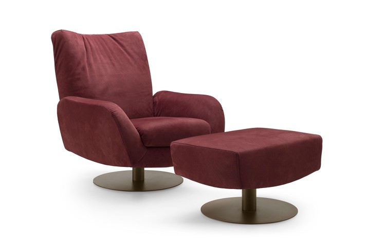 Современное кресло для отдыха с откидывающейся спинкой, центральным металлическим поворотным основанием и съемным чехлом из кожи, бархата или ткани. Также предлагается со скамеечкой для ног в тон.