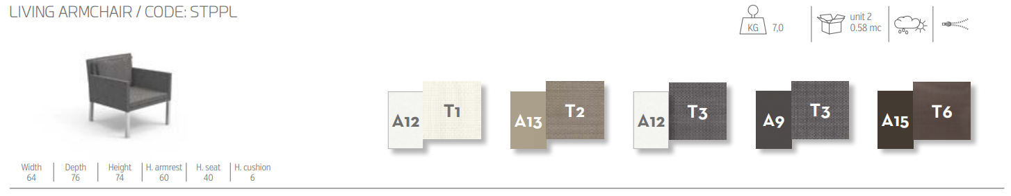 Благодаря своим динамичным и необычным формам кресло Step living идеально подходит для отдыха на открытом воздухе в стиле Talenti. Сочетание легкости сиденья и спинки делает изделие интересной, а не обычной особенностью, которая характеризует коллекцию. Каркас полностью выполнен из алюминия, а подушки, подлокотники и обивка спинки выполнены из дышащего текстиля. Устойчивы к атмосферным воздействиям.