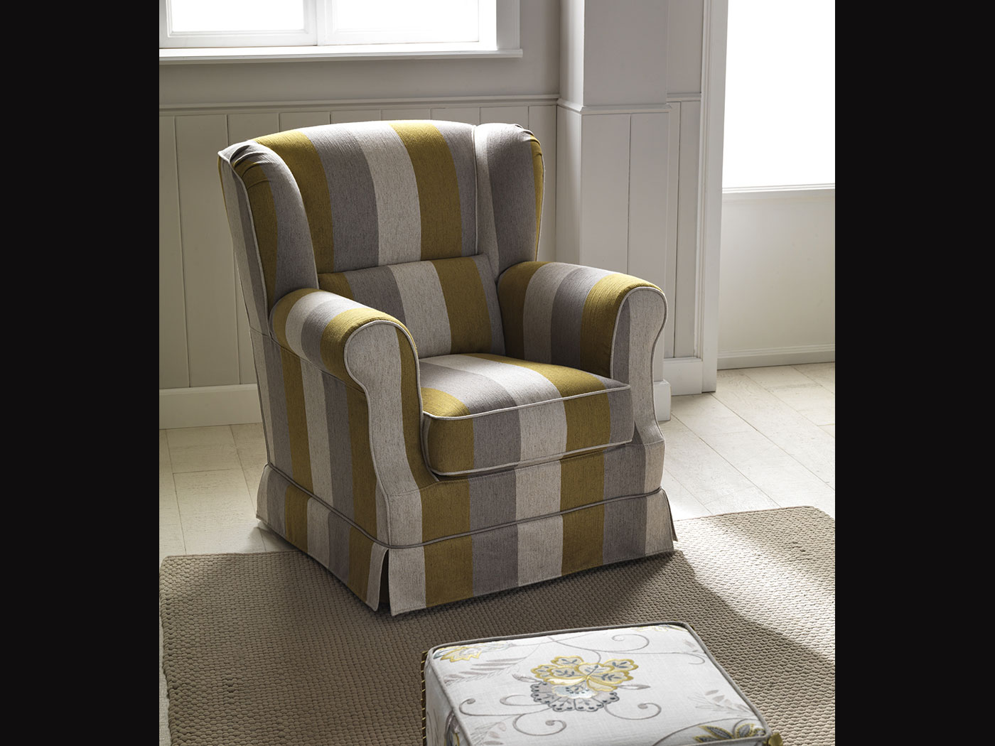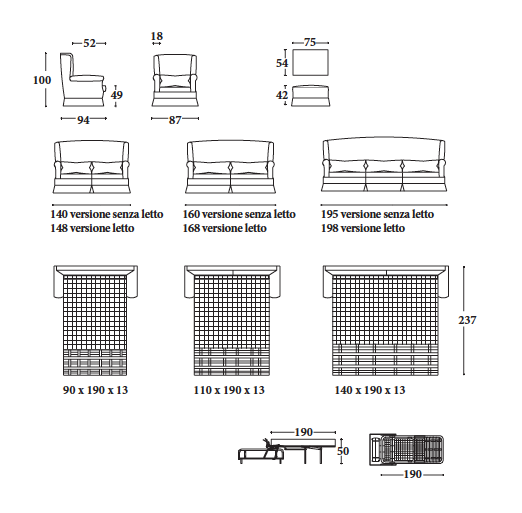 Варианты: кресло, 2-местный диван, 2 с половиной места, 3-местный и пуфик. 2-местный, 2-местный и 3-местный диван доступен в версии кровати с электросварной сеткой и матрасом из полиуретанового волокна h. 13 cm. (в версии для чтения некоторые размеры отличаются). Структура: дерево и его производные, высокопрочные перекрестные эластичные ремни. В версиях без кровати опора сиденья может поставляться с винтовыми пружинами за дополнительную плату. Набивка: пенополиуретан с различными размерами и качеством, полиэфирные волокна. По запросу вы можете настроить отступы. Особенности: полностью съемный; с оборками и профилями с окантовкой в стандартной комплектации.