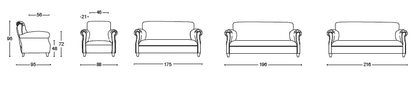 Версии: кресло, 2-местный диван, 2 с половиной места и 3 места. Структура: дерево и его производные, ремни высокопрочные перекрестные резинки. Обивка: в пенополиуретан с дифференцированными размерами и качеством, волокна полиэфир. Особенности: открытые ноги в отделке доступны в каталоге; профили с окантовкой в стандартной комплектации.