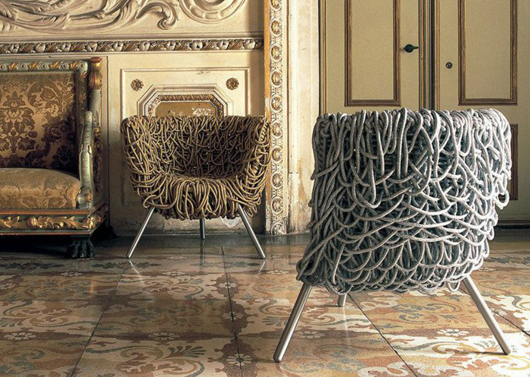 Кресло изготовлено методом нанизывания 500-метровой веревки с акриловой сердцевиной на прочный стальной каркас. Такая техника создает необычный визуальный эффект и обеспечивает комфорт.