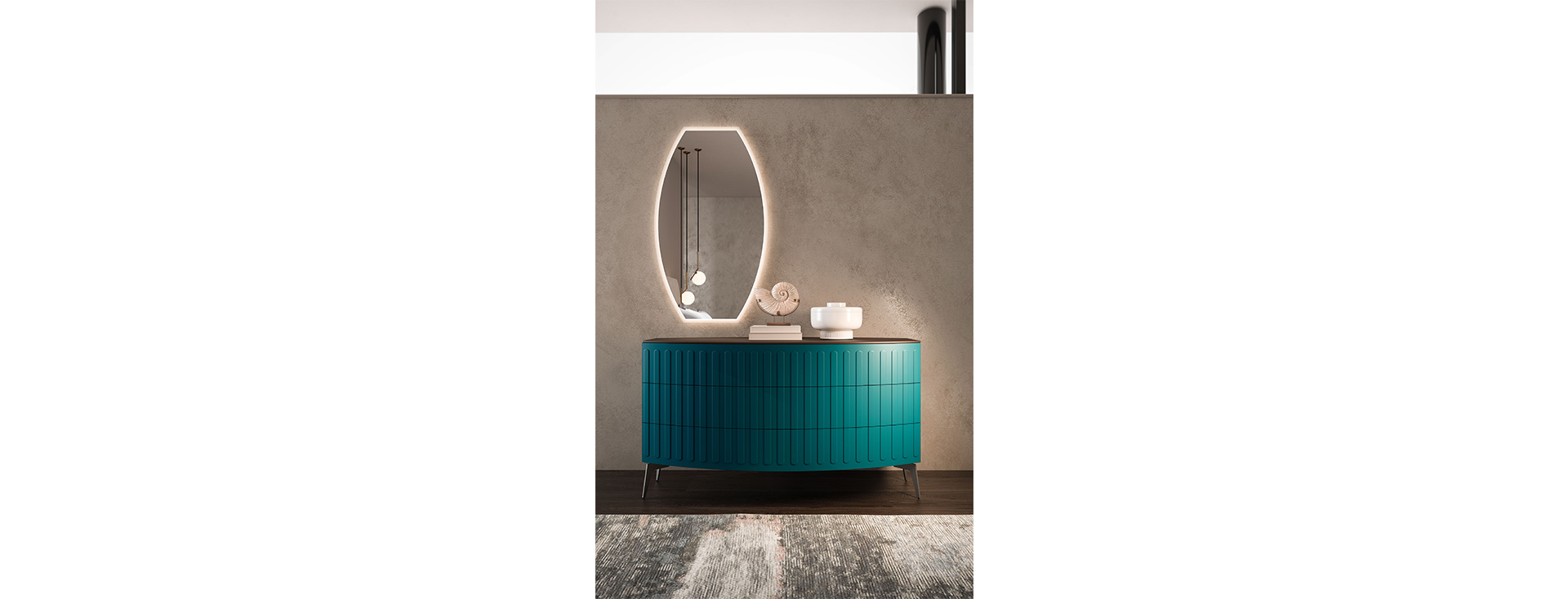 Коллекция Oceano дополнена элементами с линейным и чистым дизайном. Зеркало оснащено светодиодной подсветкой и обработано кислотным травлением по периметру.