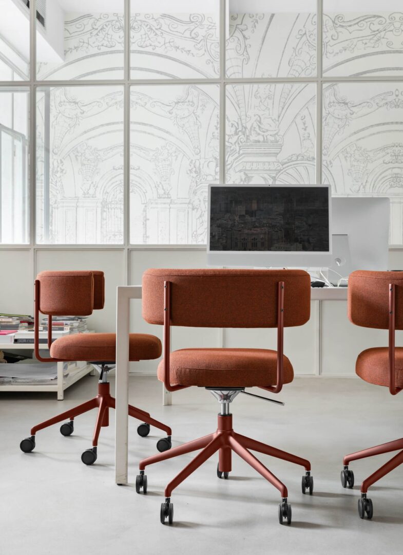 Офисное кресло Amelie изготовлено на металлическом основании на колесиках. Спинка и сиденье обиты кожей, искусственной кожей или тканью. Можно изготовить спинку и переднюю часть чехла из двух разных тканей или цветов, а также выбрать контрастную ткань или цвет для передней вставки спинки.