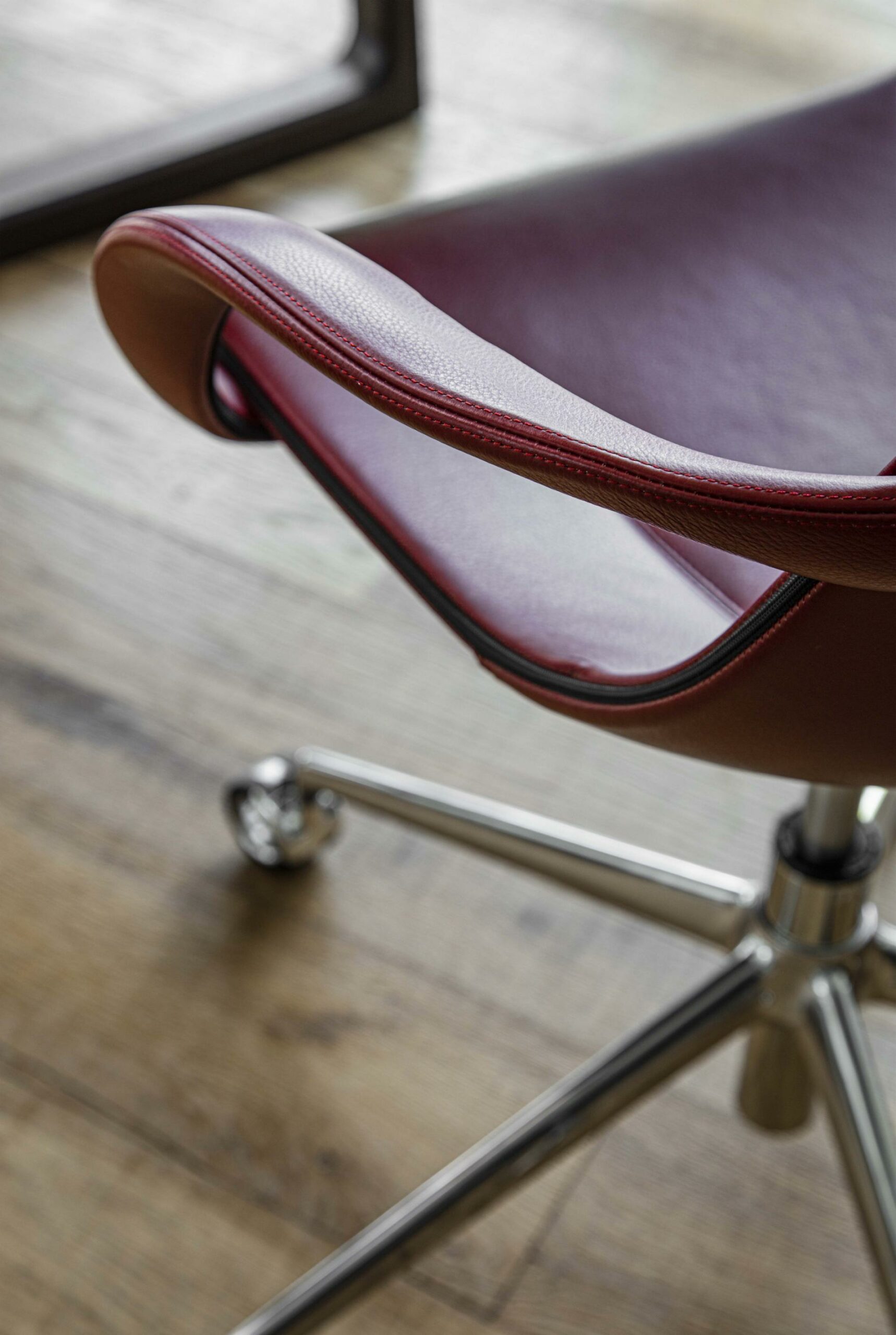 Кресло с полиуретановой обивкой доступно полностью обтянутым кожей, покрытым глянцевым лаком или покрытым глянцевым лаком с небольшим кожаным сиденьем и спинкой.