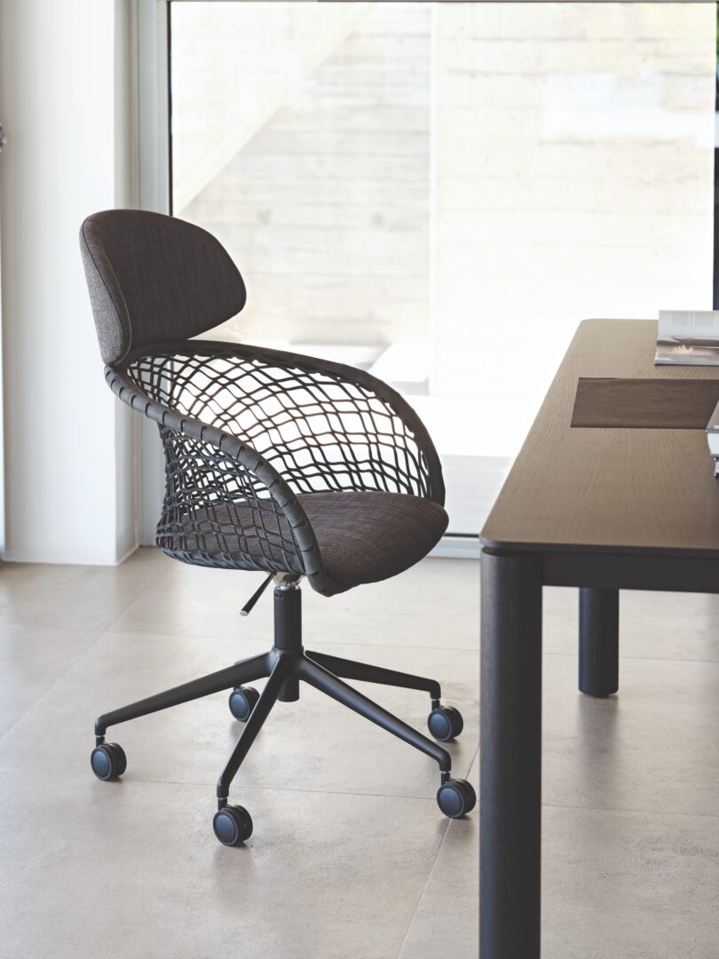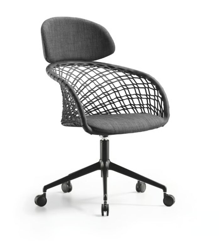 Офисное кресло P47, вращающееся и регулируемое по высоте, с металлическим основанием на пяти спицах. Спинка выполнена из натуральной кожи или тосканской кожи с подголовником. Сиденье обито кожей, искусственной кожей или тканью.