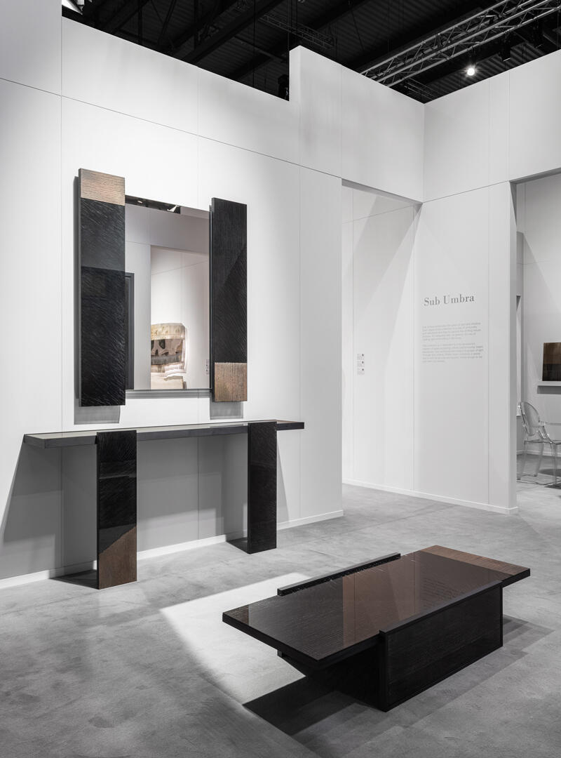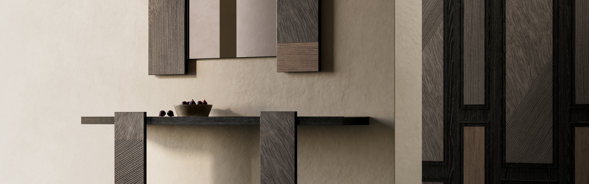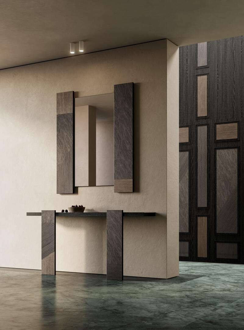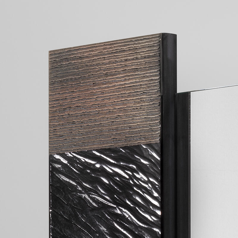 Рама из фанеры с облицовкой из ясеня, окрашенного в черный цвет. Боковые полосы покрыты особо прозрачным гравированным стеклом с темной отделкой. В центральной части зеркало на особо прозрачном скошенном стекле.