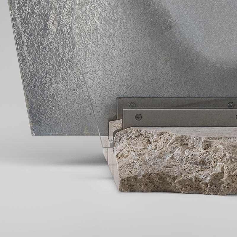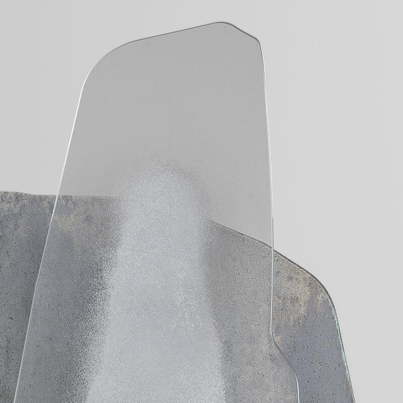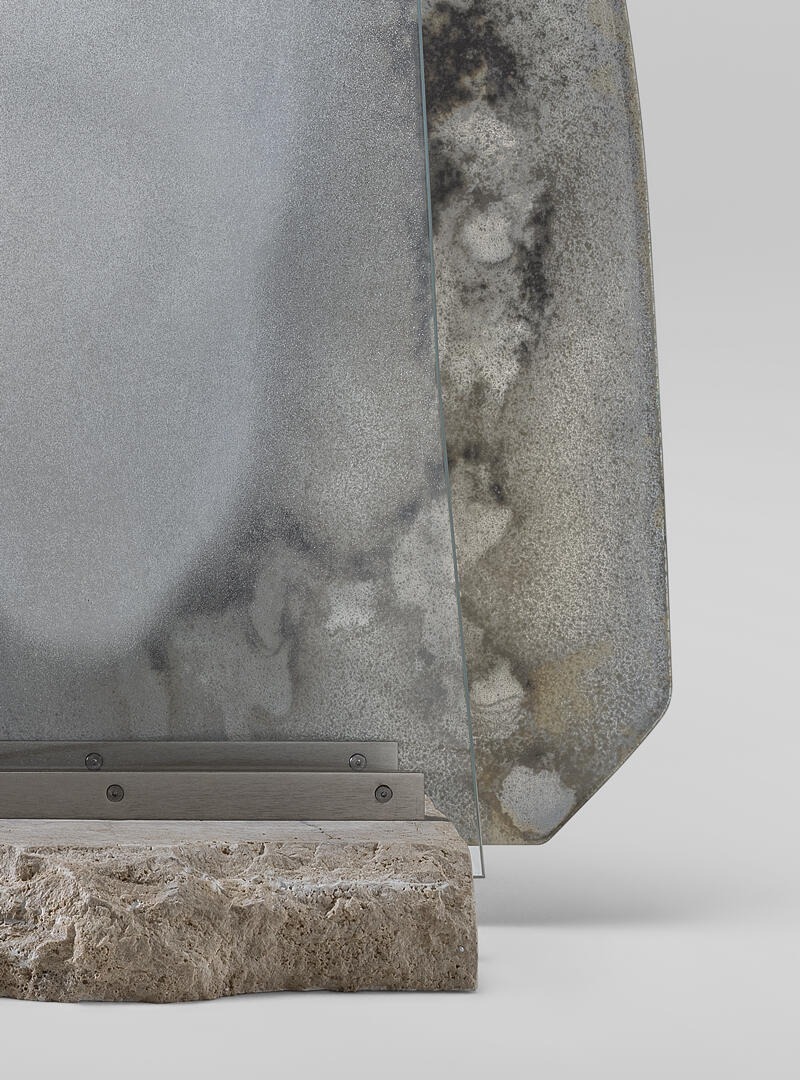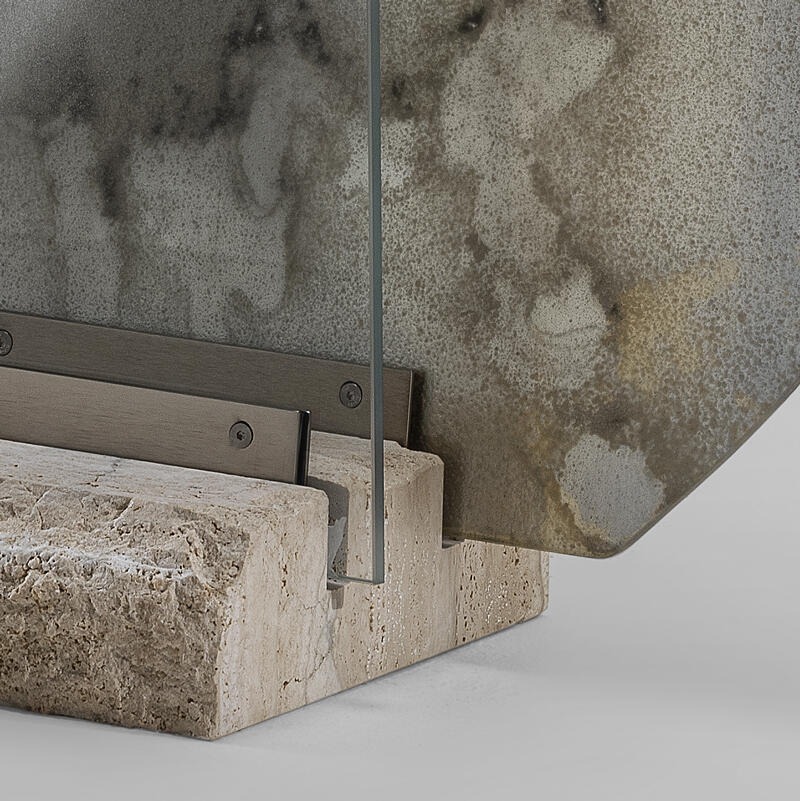 Очень прозрачное переднее стекло, слегка обожженное и частично посеребренное, с отделкой в виде лагуны. Заднее стекло, обожженное и украшенное смешанной отделкой.