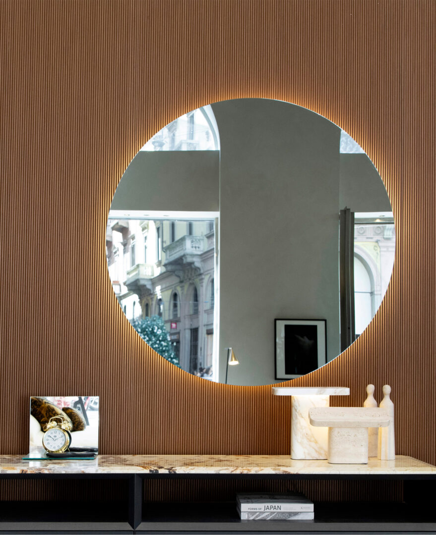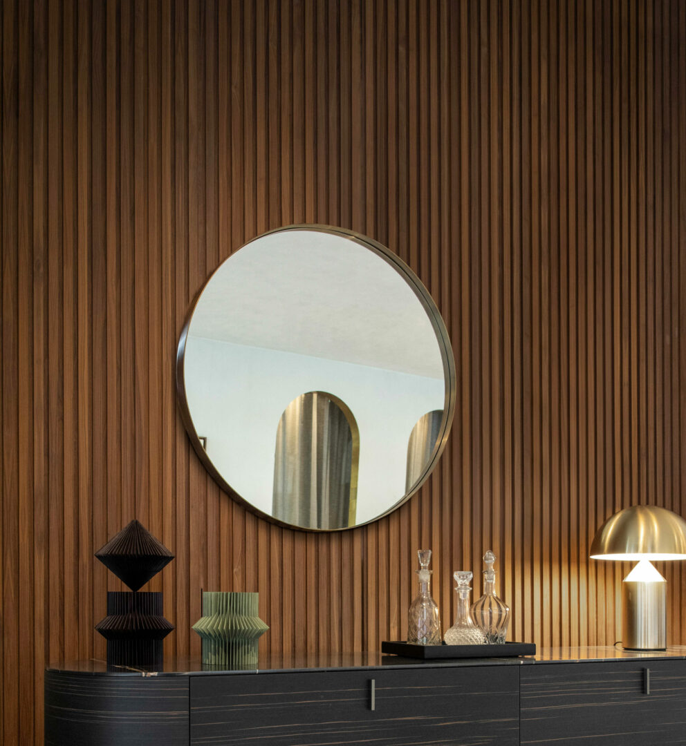 Геометрическая структура зеркала CIRCO элегантно украшает любую обстановку и доступна в коричневой или полированной латунной отделке или без рамки.