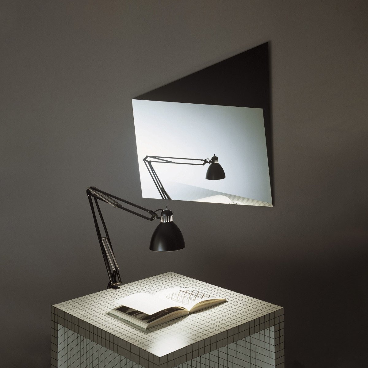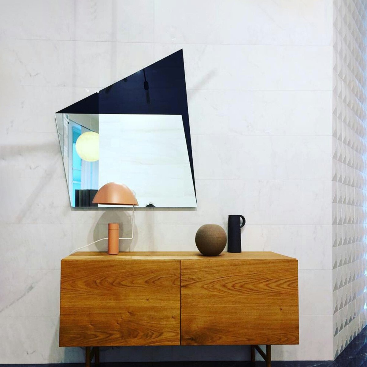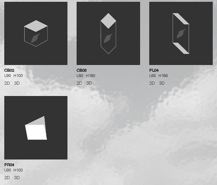 Серия зеркал геометрической формы, изготовленных из частично отражающего, частично матового или глянцевого лакированного стекла. Выпускается с двойным вертикальным и горизонтальным креплением.
