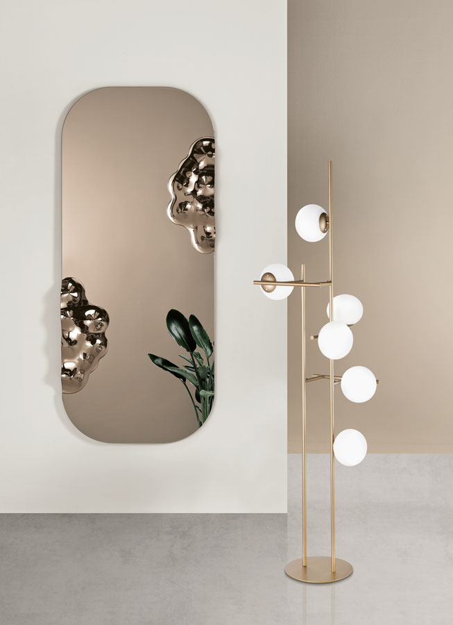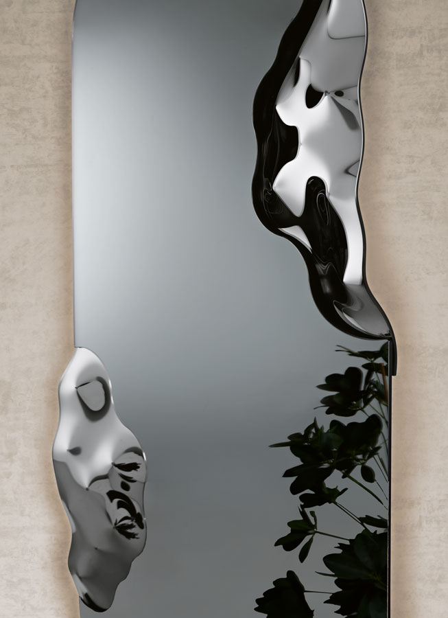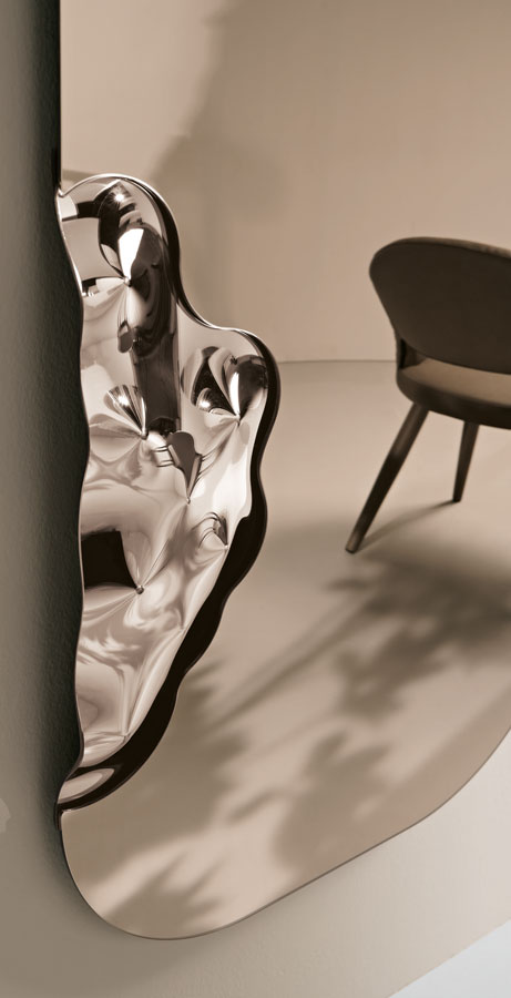 Зеркало Crown отличается уникальным контурным дизайном, где классическая элегантность сочетается с современными тенденциями. Его главная особенность — вставка из изменчивого стекла, которое создает эффект динамичного отражения, играя со светом и перспективой. Такое решение делает зеркало не просто функциональным, а настоящим арт-объектом.