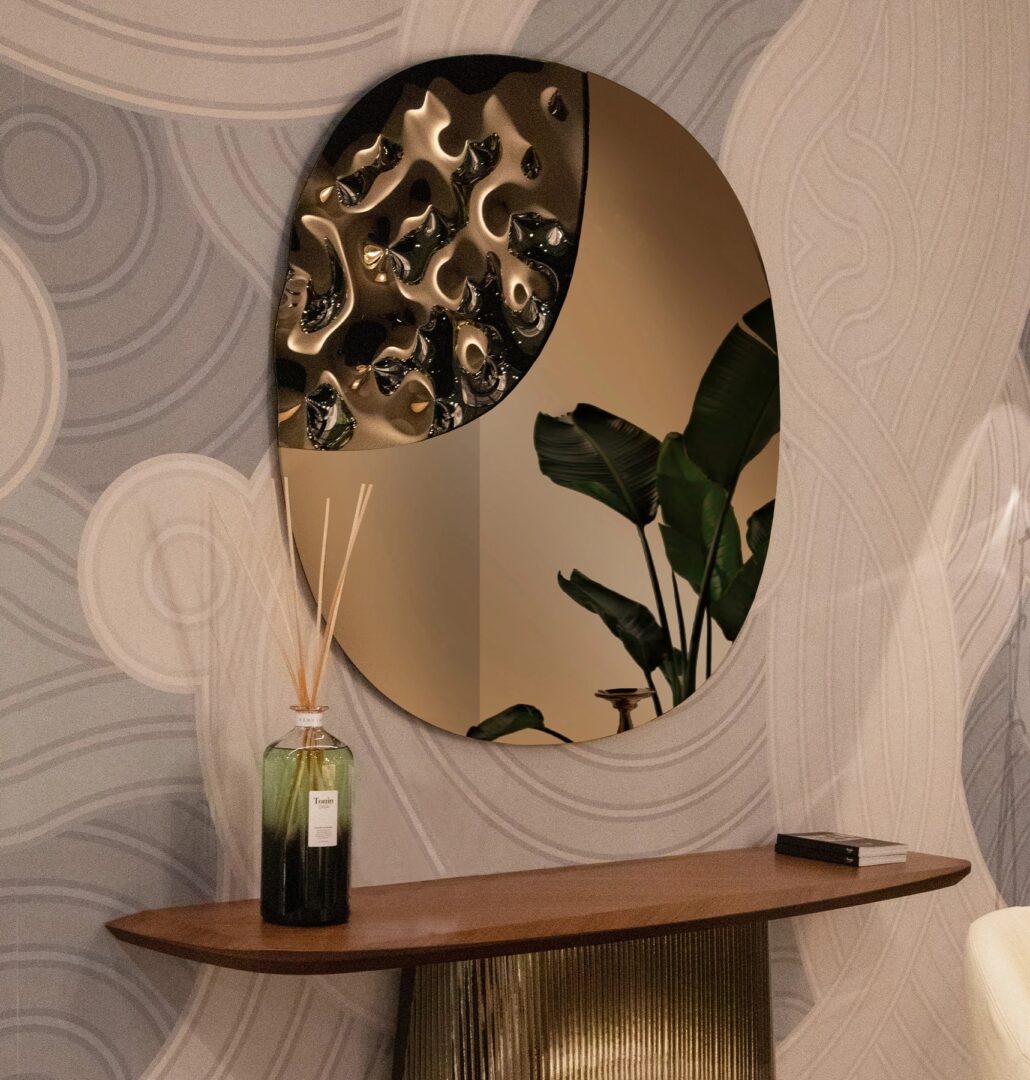Бриллиантовое настенное зеркало сияет по-разному с любой точки зрения, благодаря преломлениям, данным особой обработкой его овала, который сочетает в себе гладкую поверхность с изменяющимся стеклом, что дает особый алмазный эффект. Ценный и скульптурный дизайн, который мутирует в соответствии с точкой зрения, создавая уникальный эффект движения.