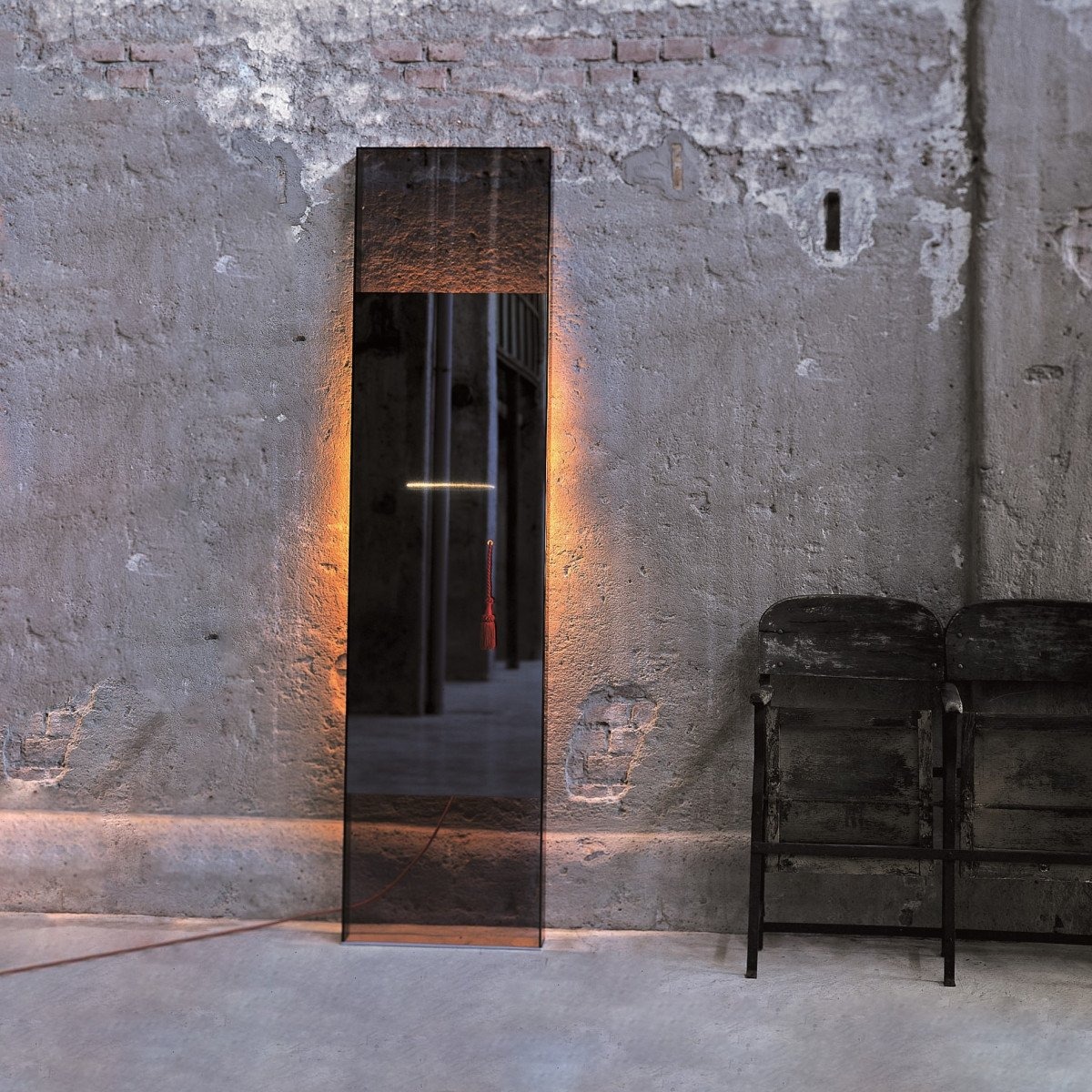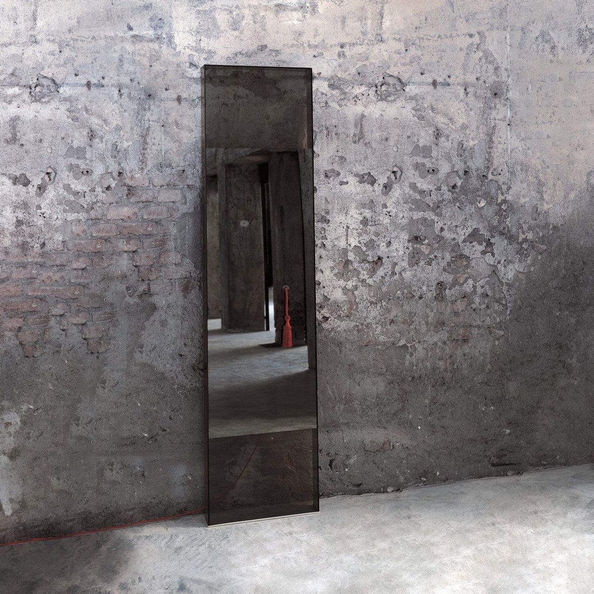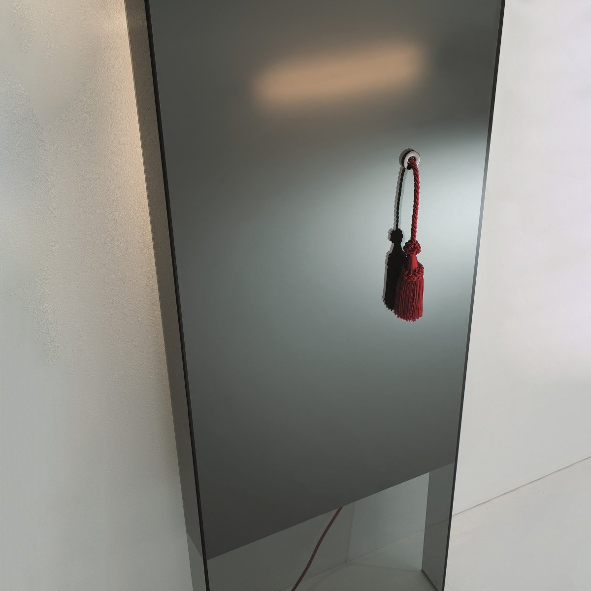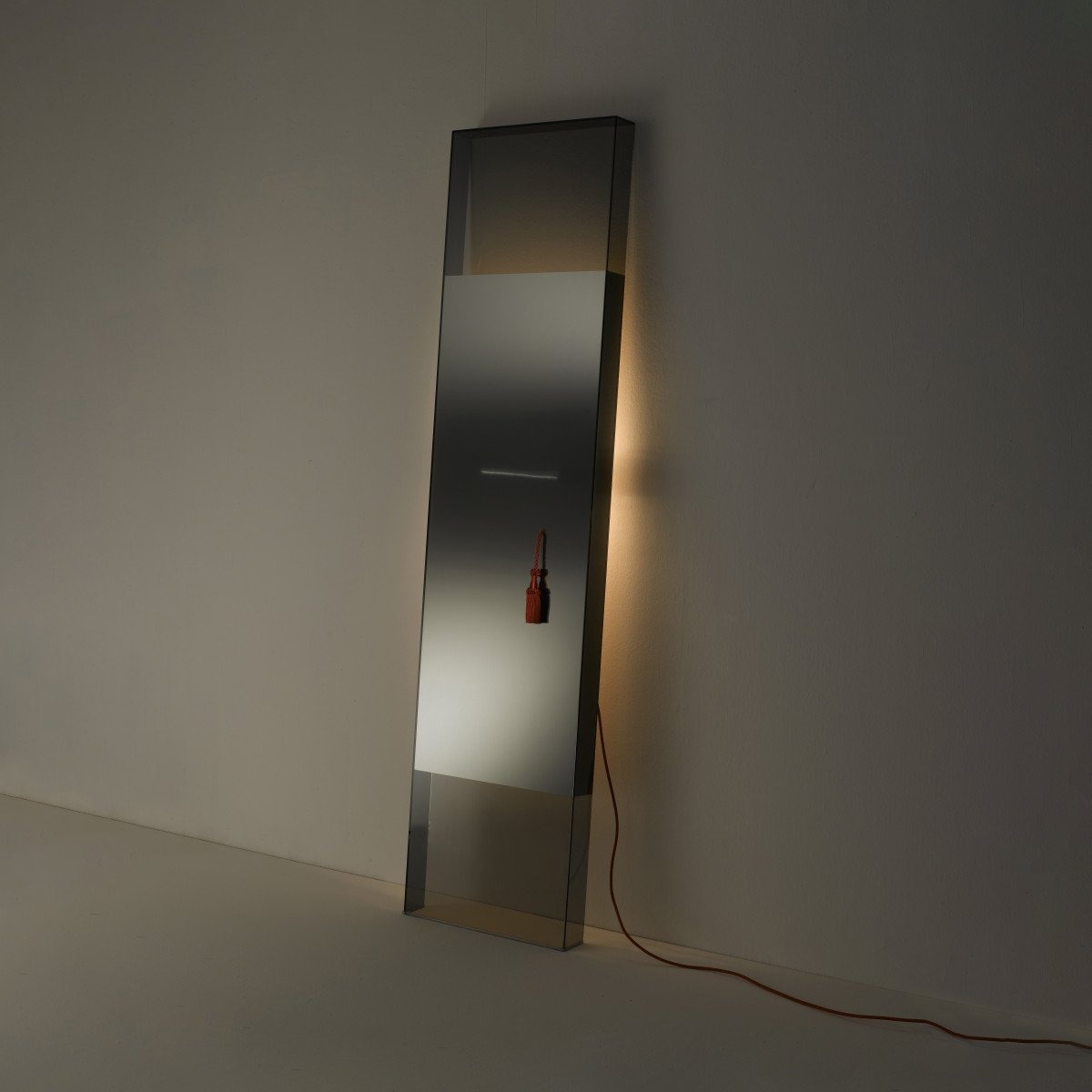 Настольное зеркало выполнено из клееного дымчатого стекла. Верхняя и нижняя части прозрачны, а центральная часть имеет специальный зеркальный эффект, благодаря которому виден светящийся след от лампы, расположенной на задней панели. Лампу можно включать и выключать, потянув за красный шнур.