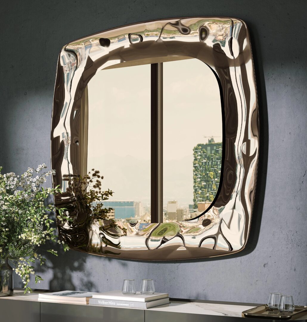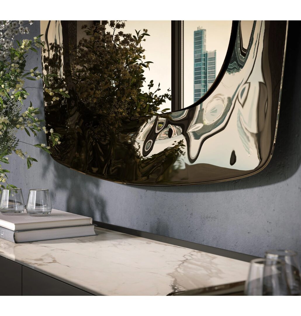 Зеркало, сочетающее искусство и дизайн, с рамкой из расплавленного стекла с движущихся поверхностей, которая создает изысканный контраст с центральным зеркальным стеклом. Две формы гармонично взаимодействуют, дополняя друг друга, чтобы создать объект с идеальными визуальными пропорциями, способный улучшить любую среду. Геометрия, между плавностью и строгостью, создает визуальный диалог, в котором каждая линия находит свой баланс в целом.