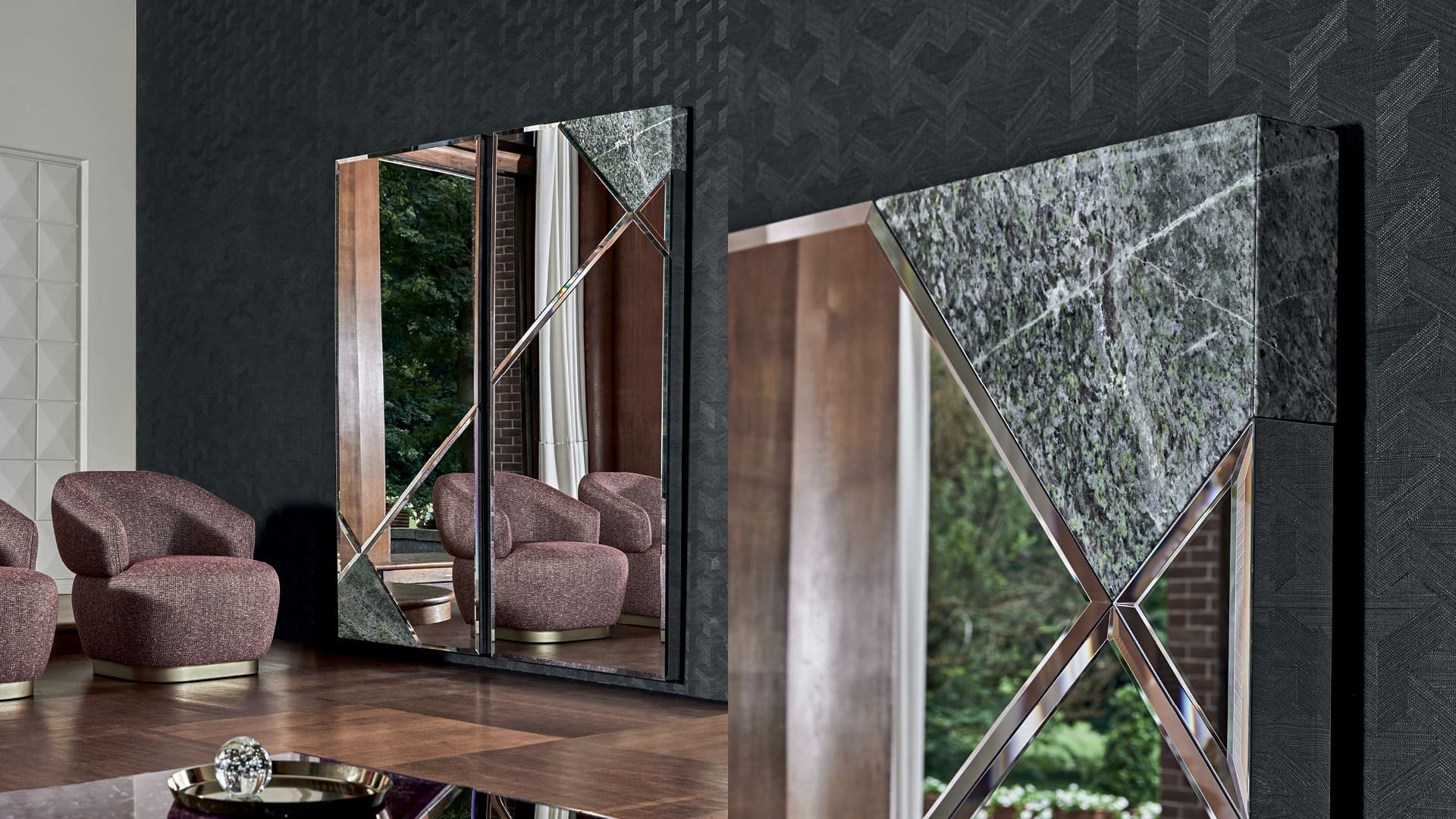 Прямоугольное зеркало с мраморной отделкой Esther представляет собой шедевр точности в сочетании материалов. Его дизайн выполнен в форме параллелепипеда, покрытого зеркалами, которые искусно соединены для создания элегантной композиции.