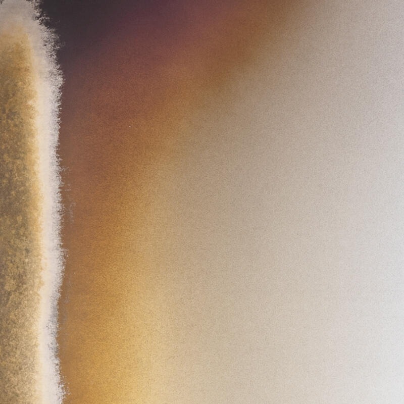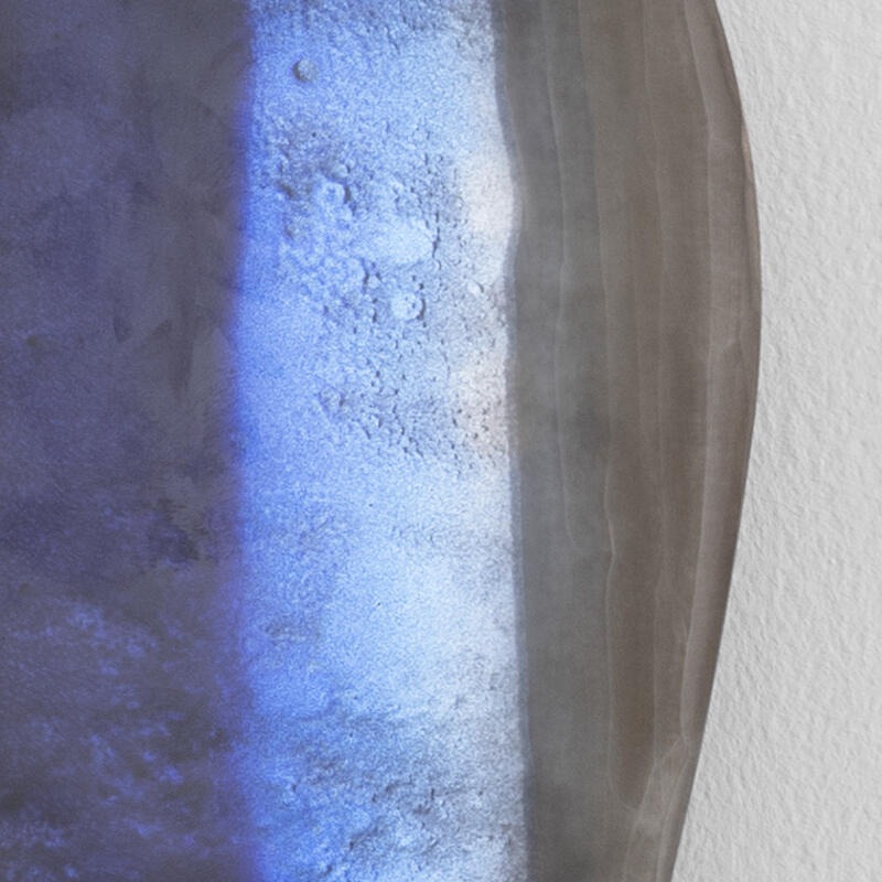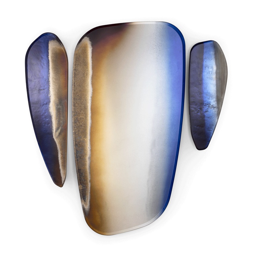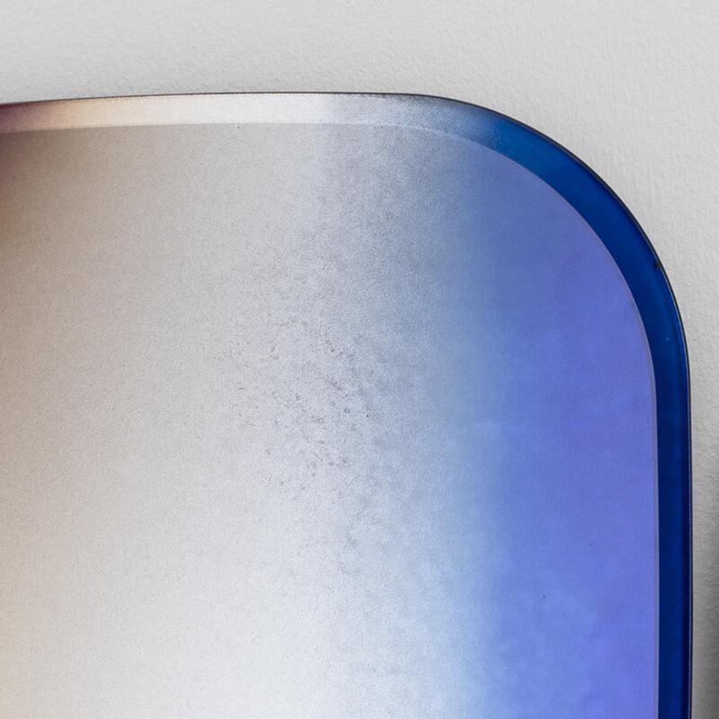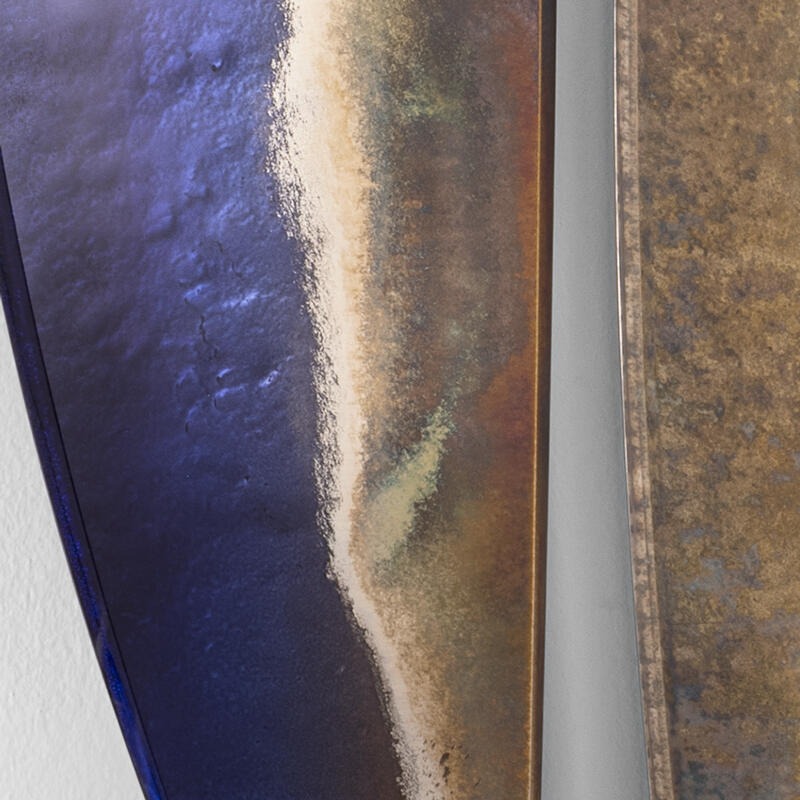Частично обожженное и скошенное стекло, декорированное оттенками синего и серебристого с различной степенью состаривания и эффектом меди.