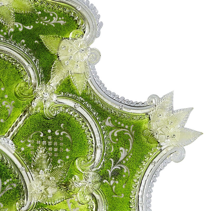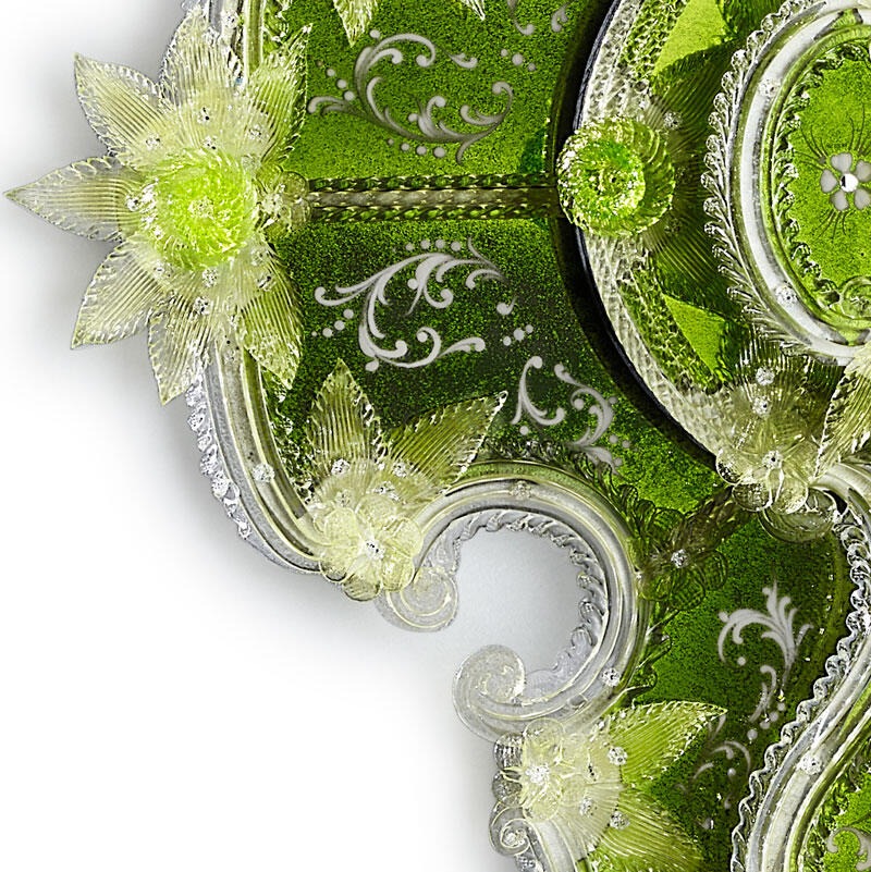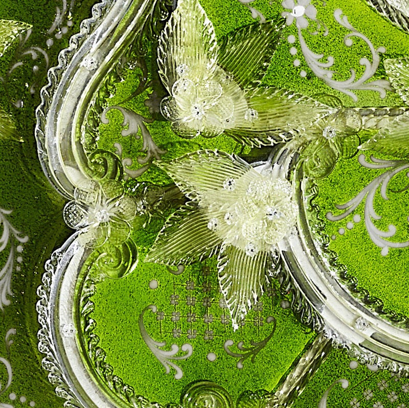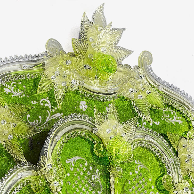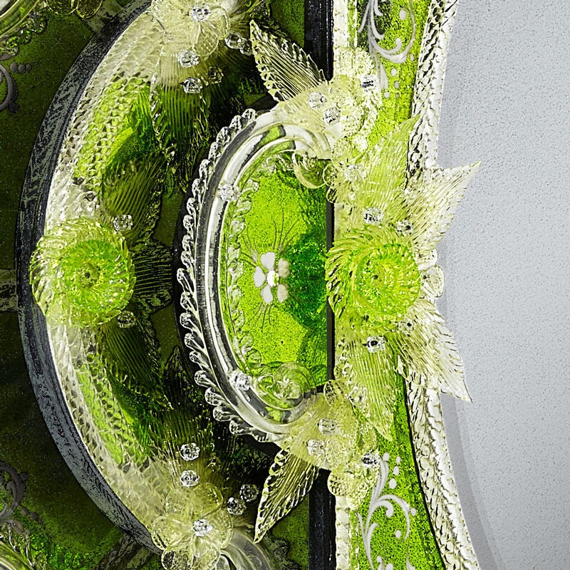 Конструкция из елового дерева с черной отделкой под старину. Трехуровневое зеркало с венецианской гравировкой из стекла, покрытого кислотно-зеленым лаком, и зеркальным покрытием под старину среднего размера.