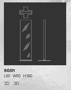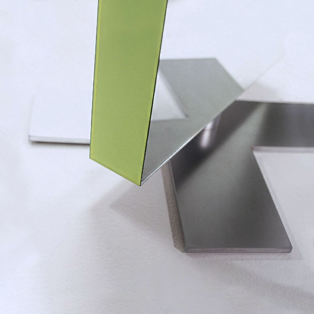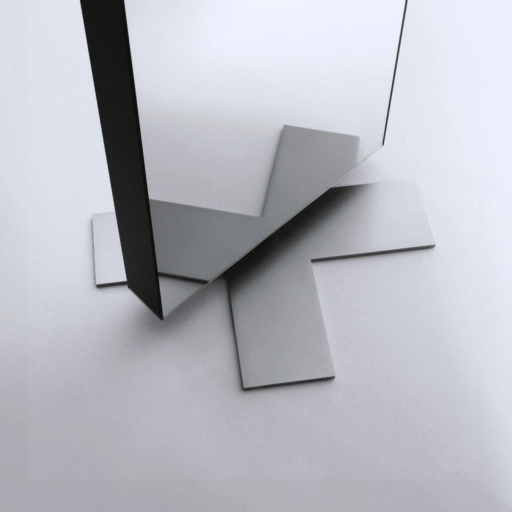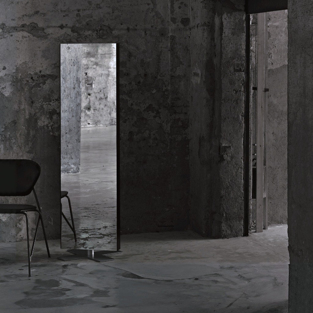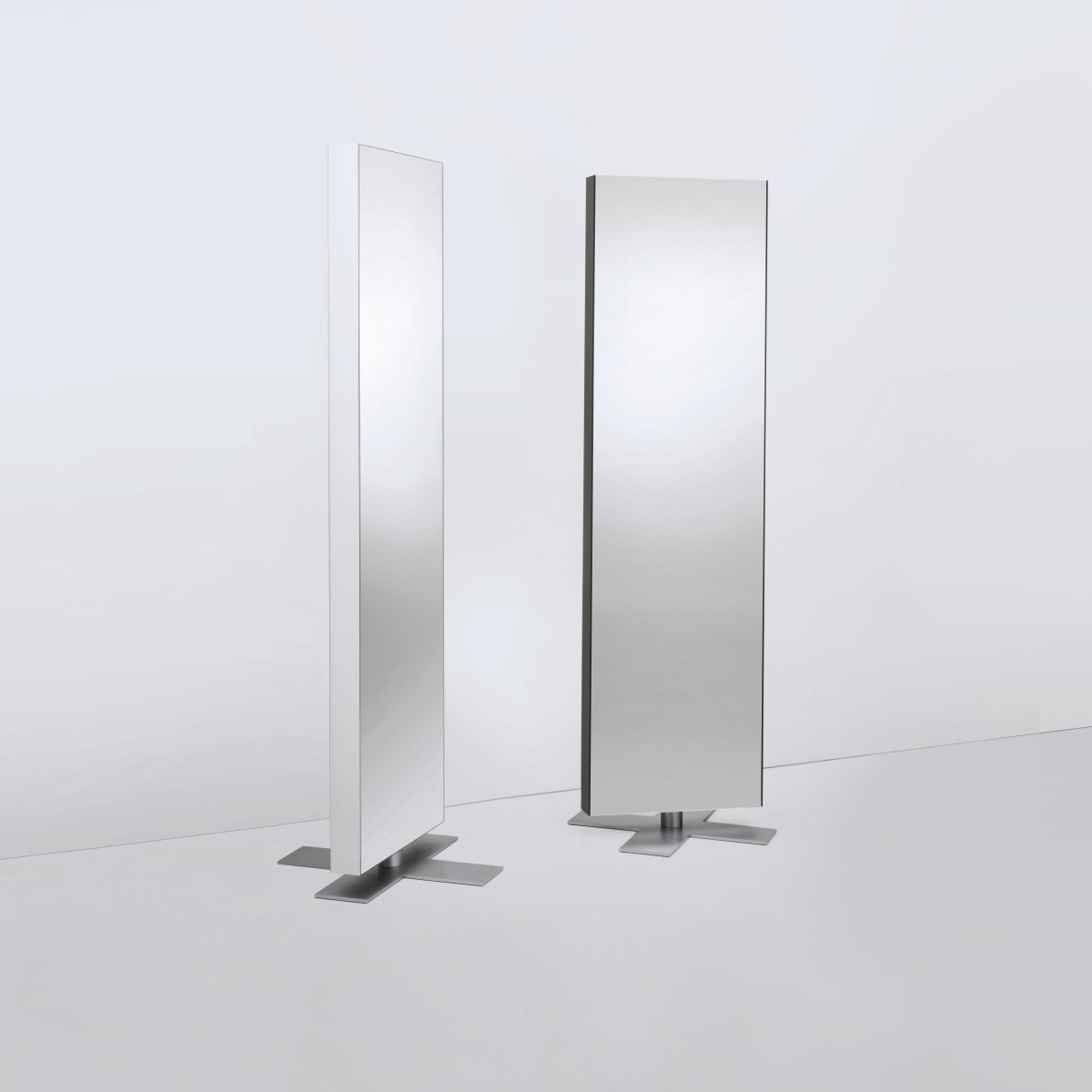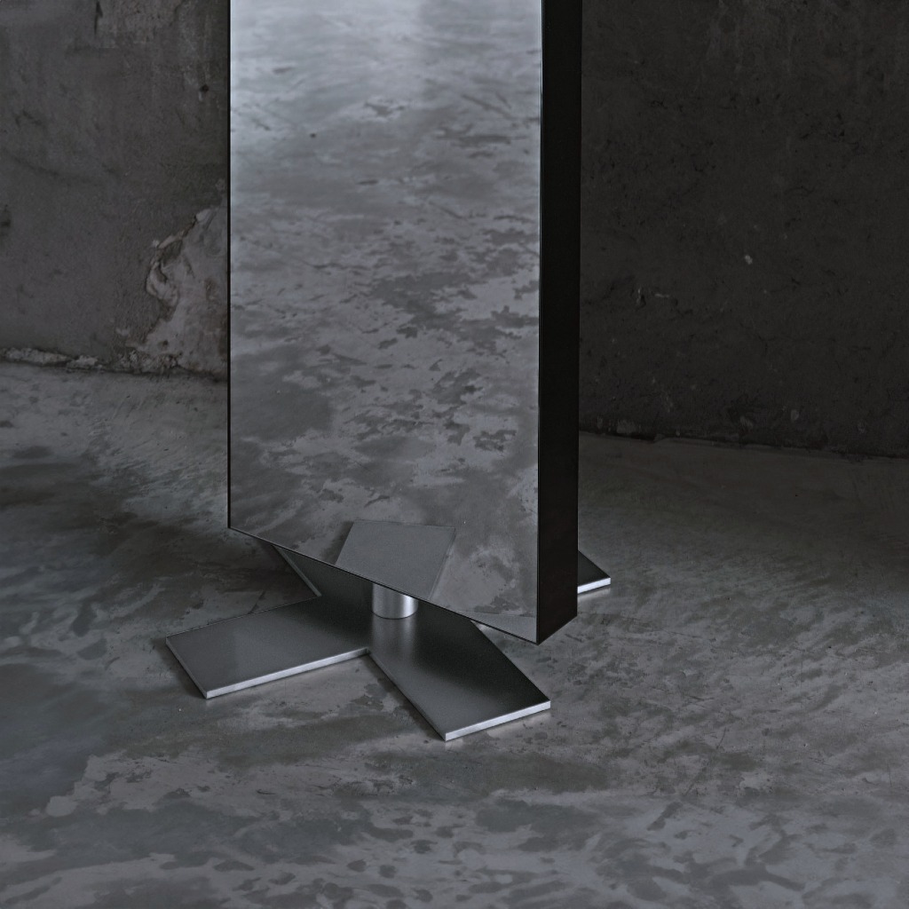 Стоячее прямоугольное двухстороннее и вращающееся зеркало для туалета, изготовленное путем склеивания зеркальных пластин со скошенными под углом 45° полосами из глянцевого лакированного стекла. Основание из матового металла inox.