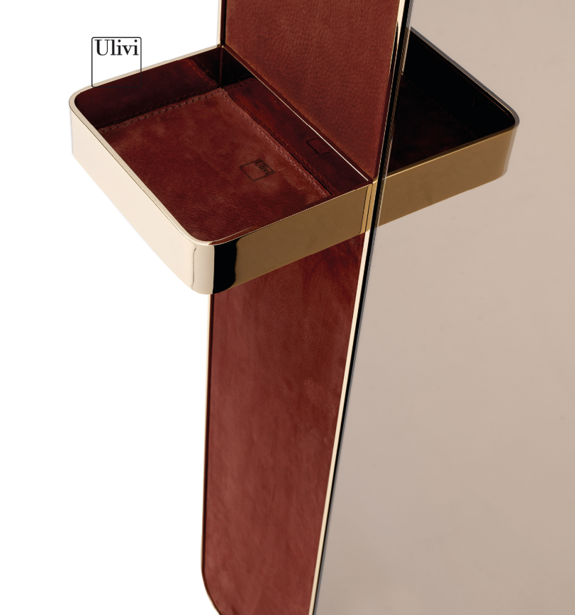 Структура : Зеркало доступно в настенном и напольном исполнении.Внешний Конструкция и каркас выполнены из металла, сатинированного или глянцевого покрытия. Аксессуары : Для напольного исполнения — небольшой поддон вдоль рамы с металлическим профилем, внутри обитый кожей..