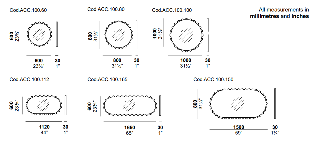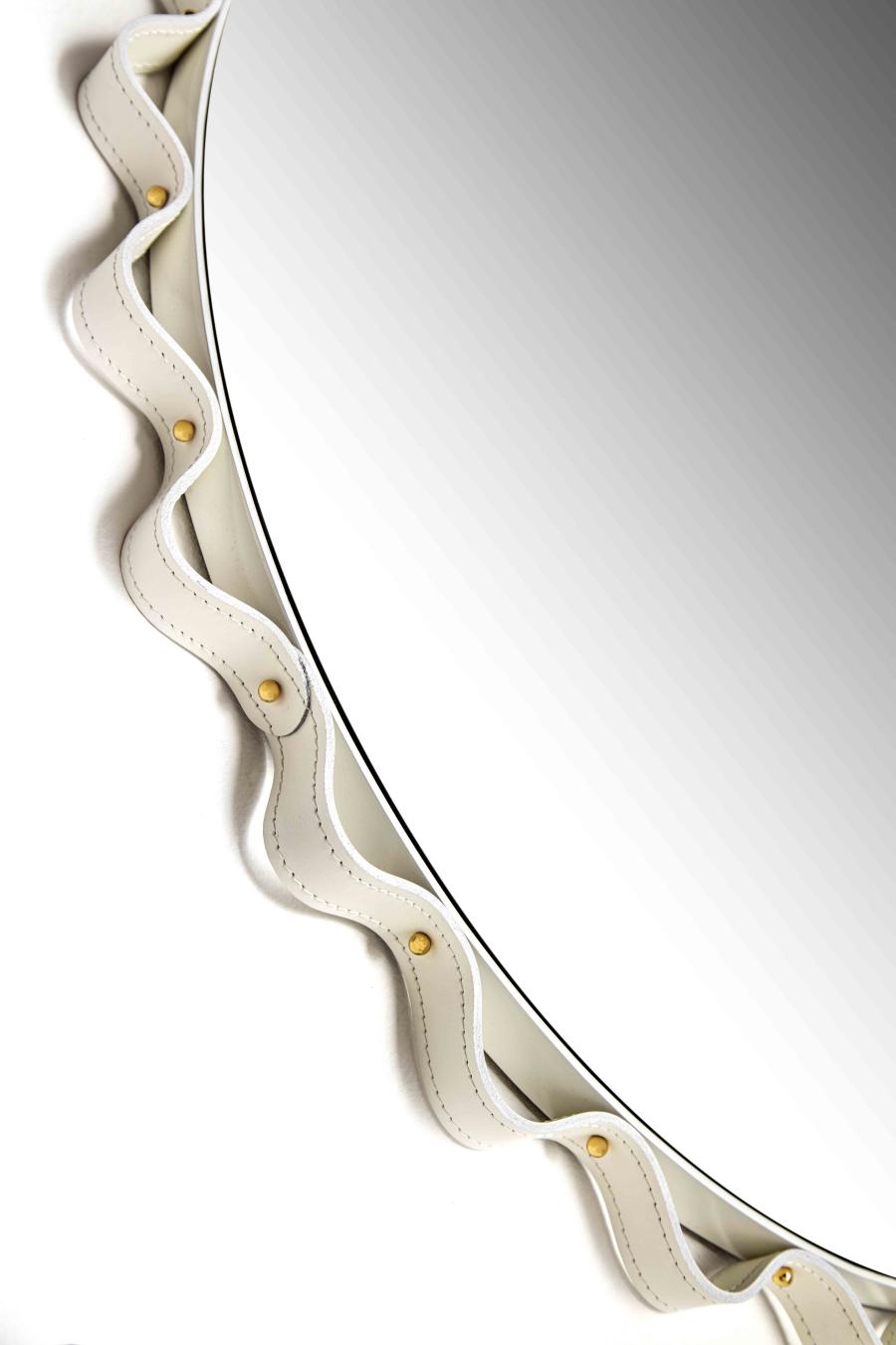 Круглые и овальные зеркала с металлической конструкцией, окрашенные в несколько вариантов (матово-черный, матово-белый, графитовый или бронзовый) и обтянутые кожаной лентой.