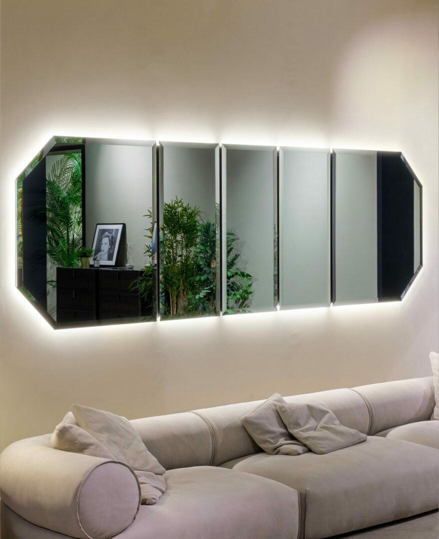 Зеркало KARL ROYAL имеет модульную стеклянную конструкцию со скошенной под углом 45 градусов рамой. Зеркало становится главным героем, украшая стену, на которую оно прикреплено. Модель доступна в 2-х различных цветах, с подсветкой и без подсветки.