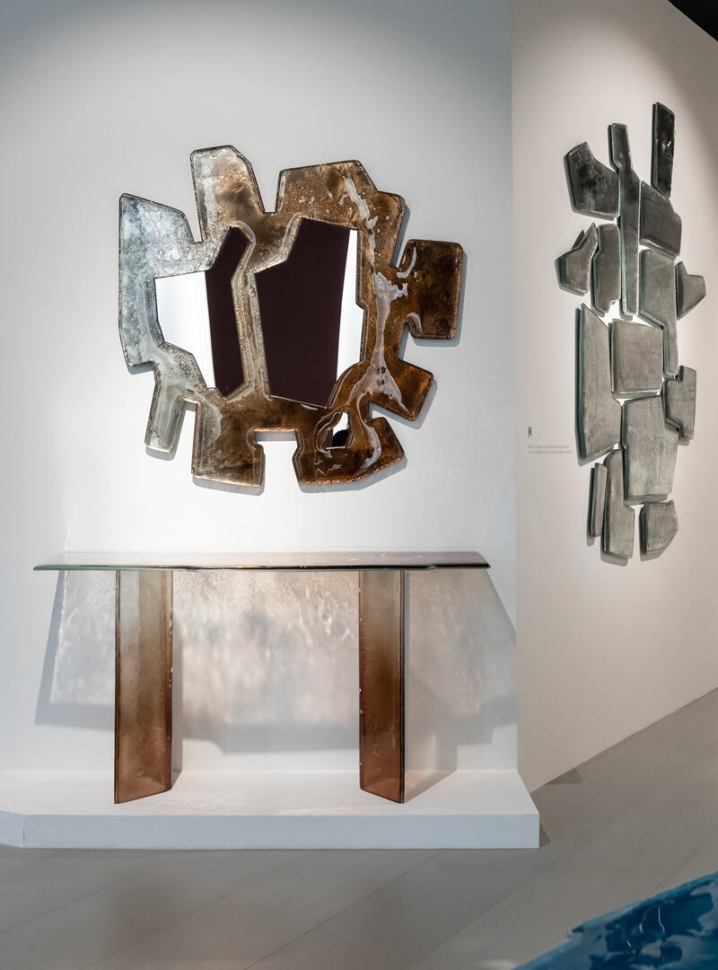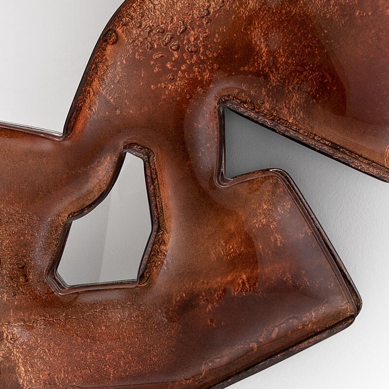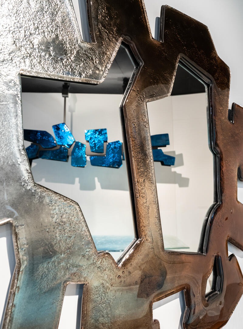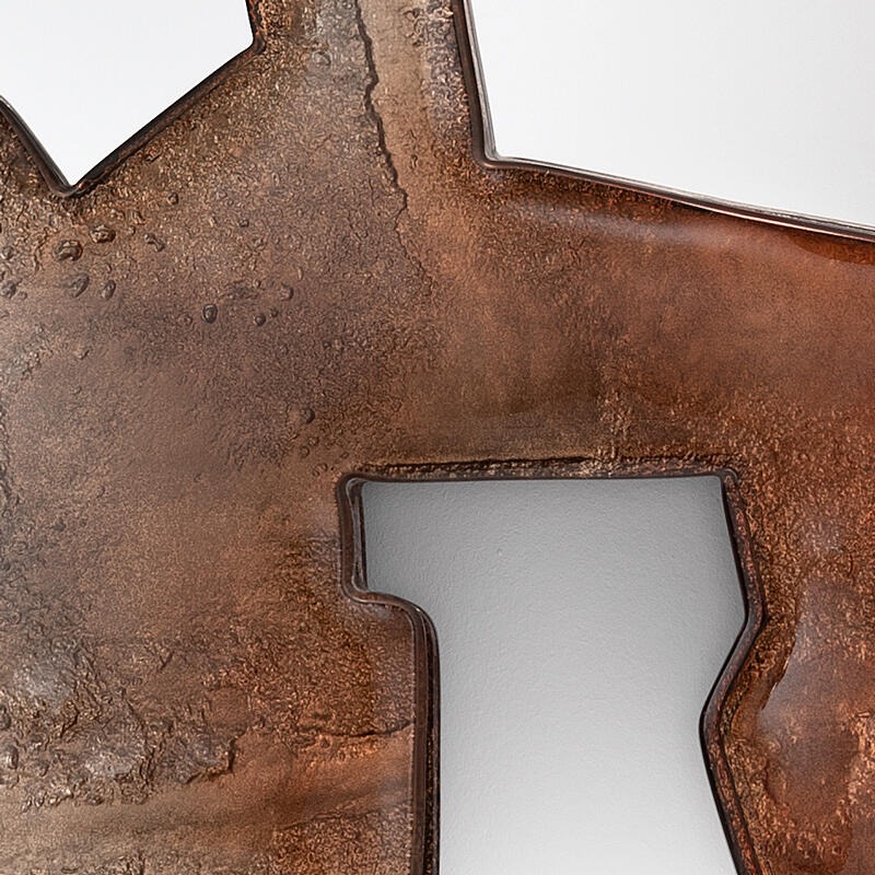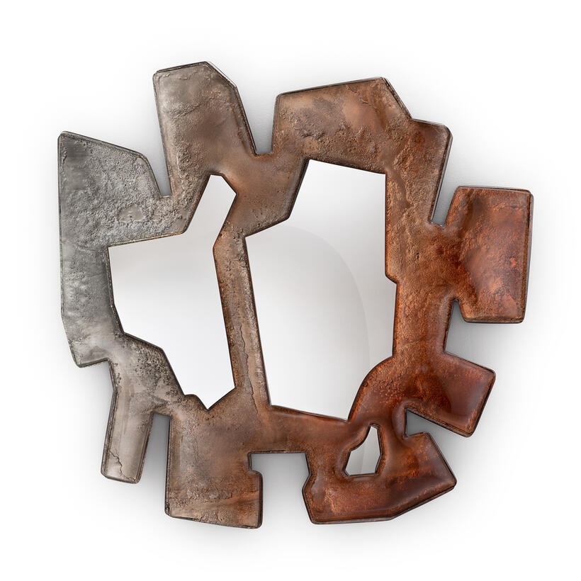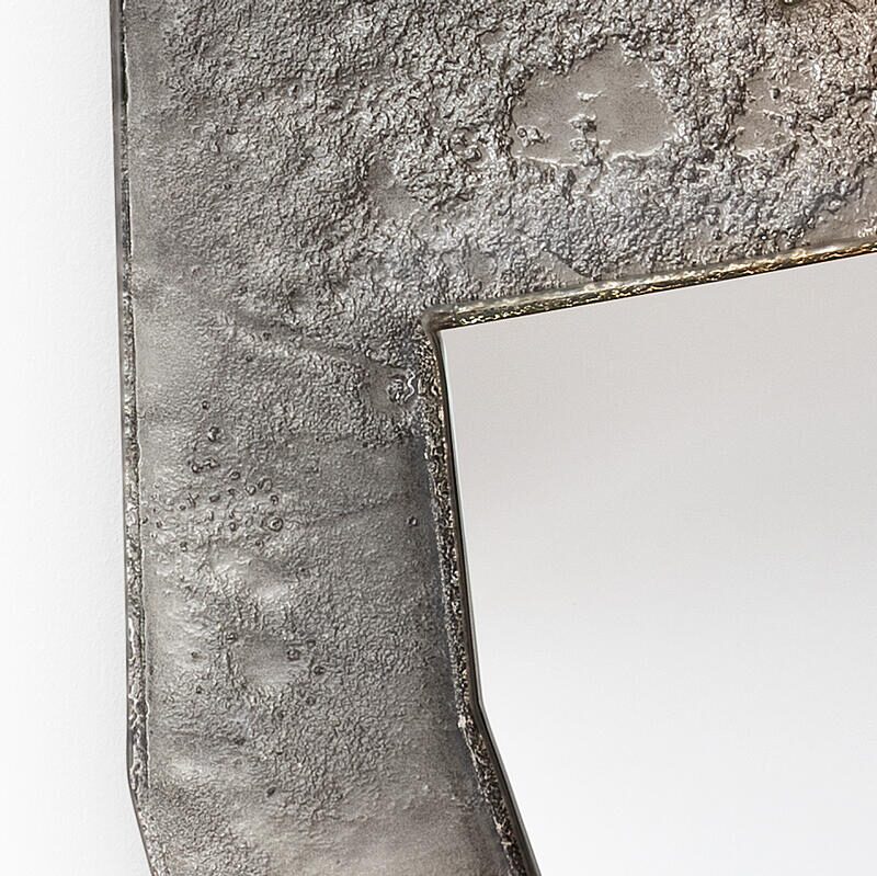 Двухслойная рама из обожженного стекла с неровными краями, покрытая лаком от бронзового до прозрачного, все изделие посеребрено с отделкой под старину.