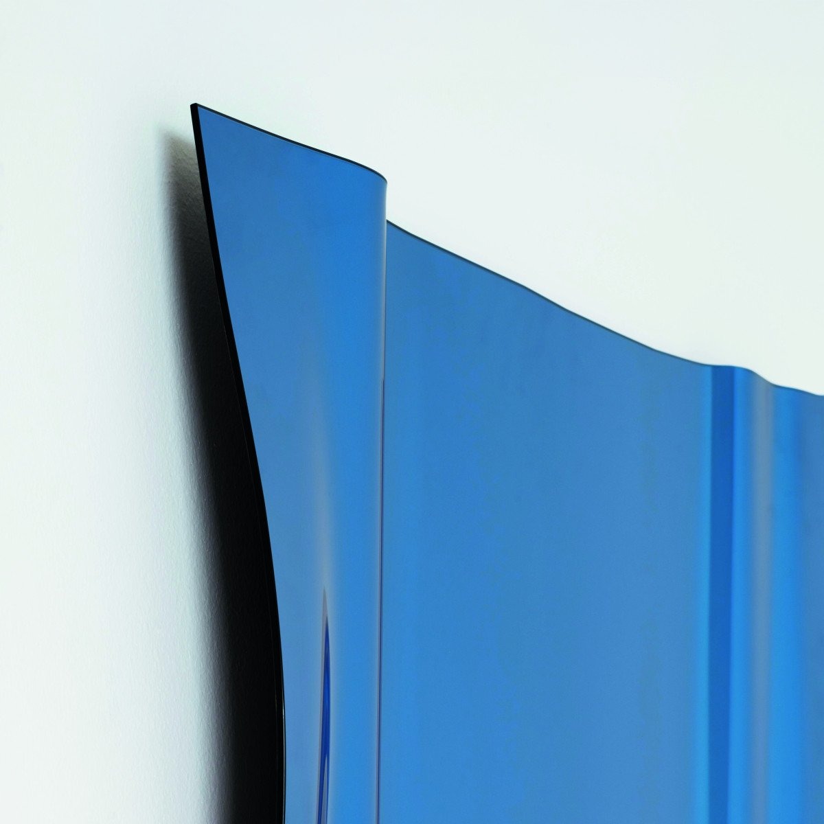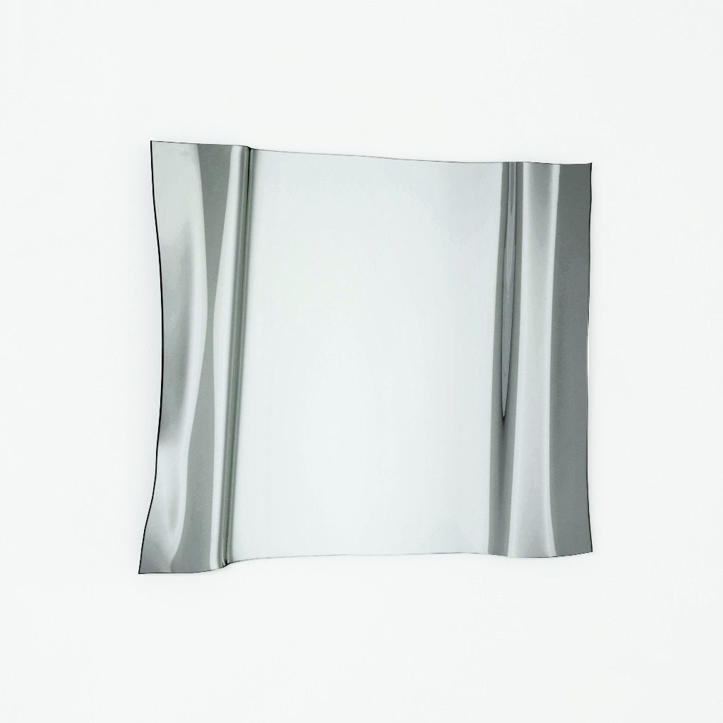 Зеркала, изготовленные из цельного листа сверхлегкого или голубого стекла, слегка волнистые с обоих концов и посеребренные вручную, имитируют колышущуюся драпировку или поверхность жидкости, по которой пробегают тонкие волны. Волнообразные отраженные изображения искажаются неожиданным образом, в то время как идеально ровная поверхность в центре гарантирует точное отражение и функциональное использование. Зеркала, доступные в двух размерах, можно свободно подвешивать в любом направлении.