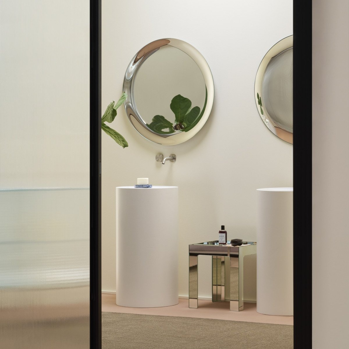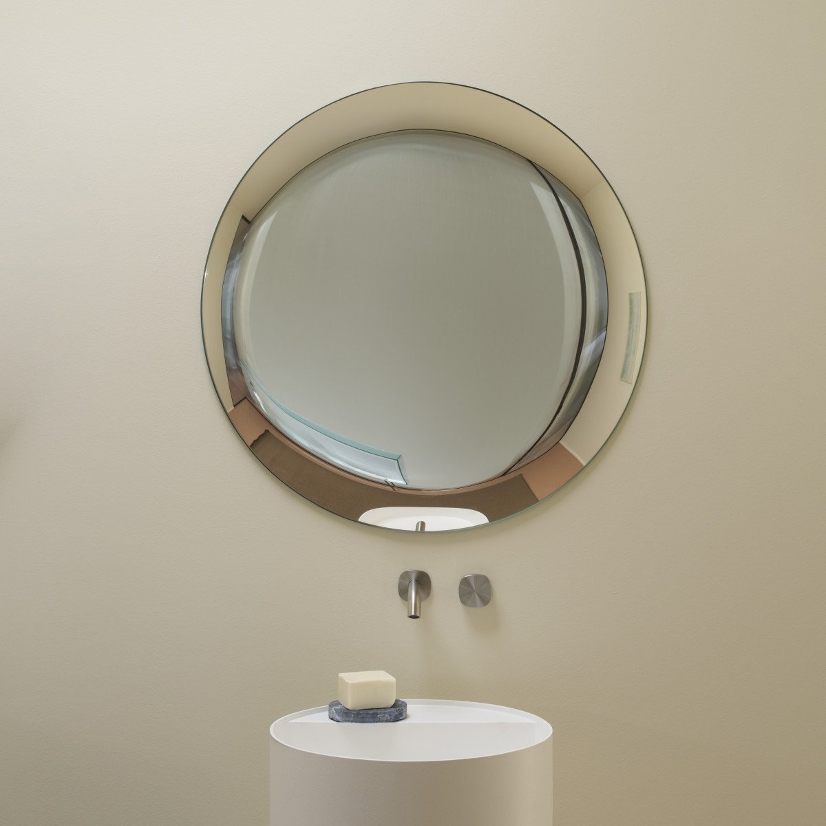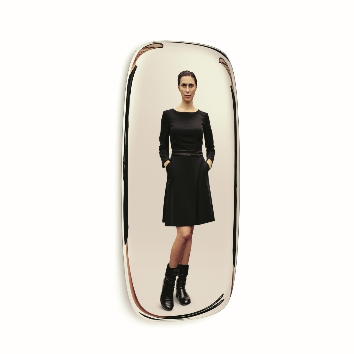 Зеркала изготовлены из цельного листа особо прозрачного стекла, которое, благодаря инновационным и сложным технологиям обработки, изогнуто по всему периметру и вручную посеребрено до совершенства. В зависимости от серебряной поверхности получается зеркало с вогнутой или выпуклой поверхностью, с рамкой, отражающей изображения и произвольно искажающей их, в то время как идеально ровная область в центре гарантирует истинное отражение и функциональное использование. Прямоугольная форма доступна в двух размерах и может быть подвешена в любом направлении. Задняя сторона вогнутой версии доступна в серебристом или оранжевом цветах Pantone 163C.