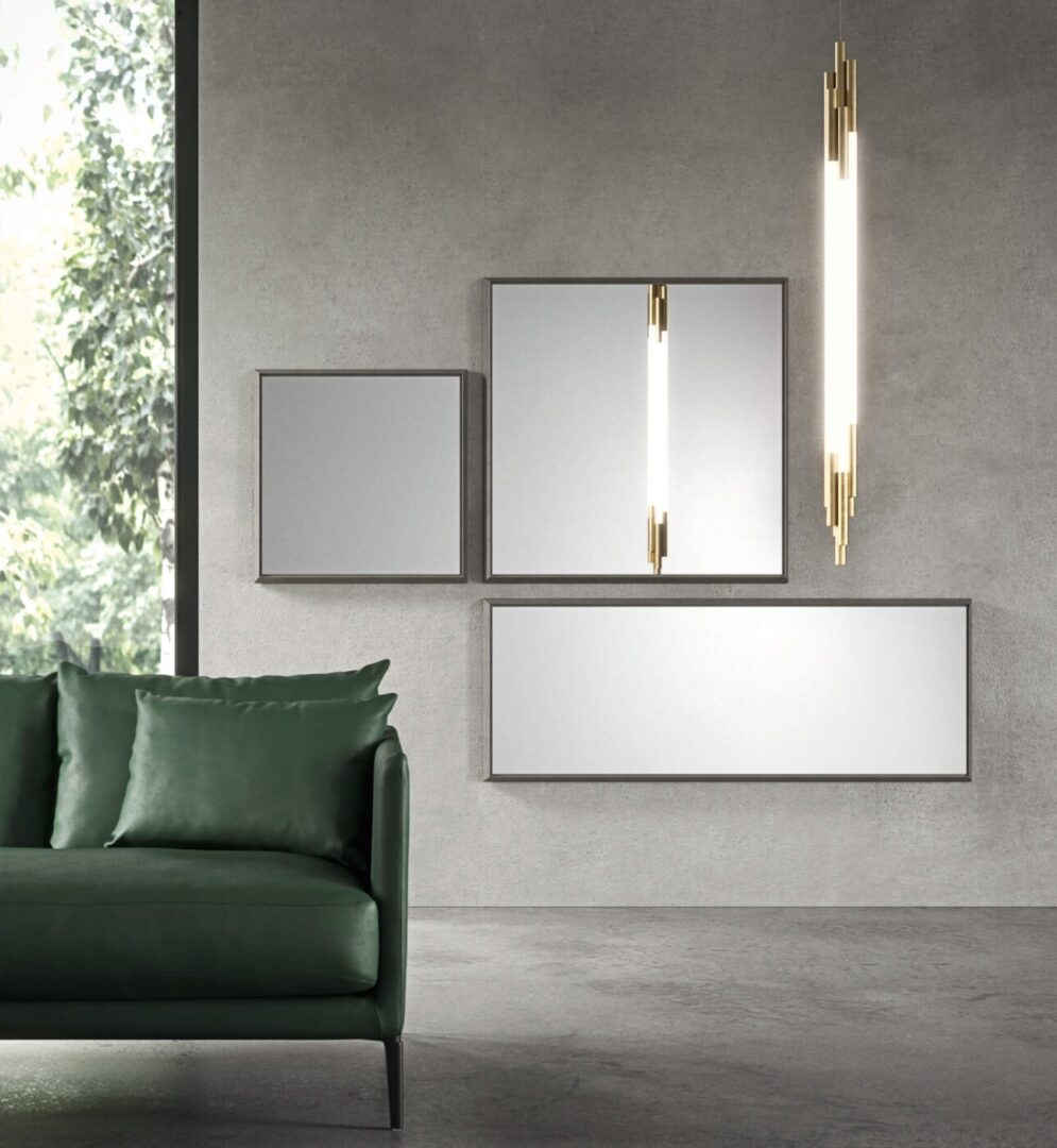 Квадратные и прямоугольные формы, которые можно размещать на стене вертикально или горизонтально. Зеркальные поверхности различных размеров элегантно заключены в расширяющуюся деревянную раму, окрашенную в стандартный металлический цвет.