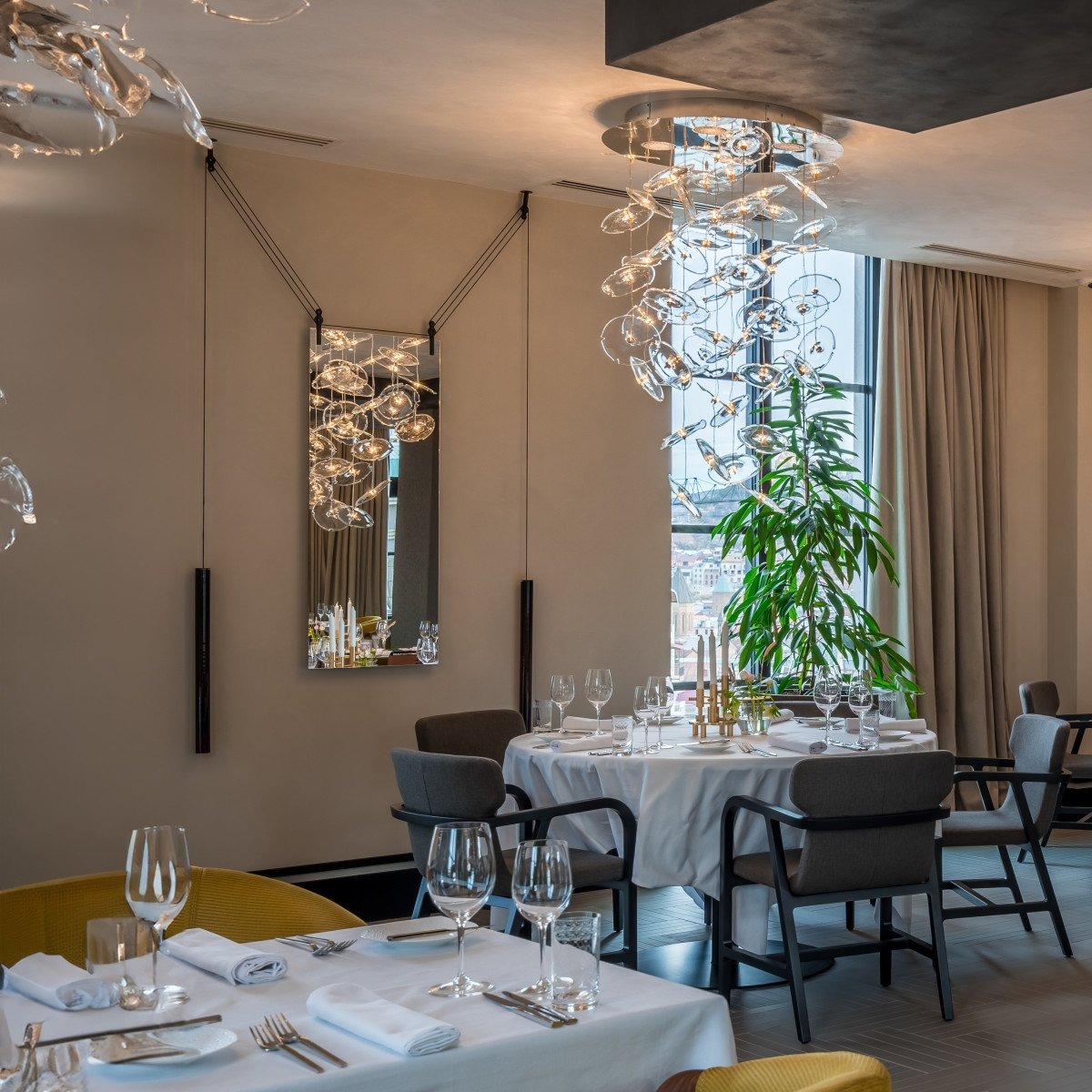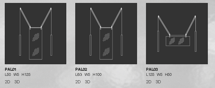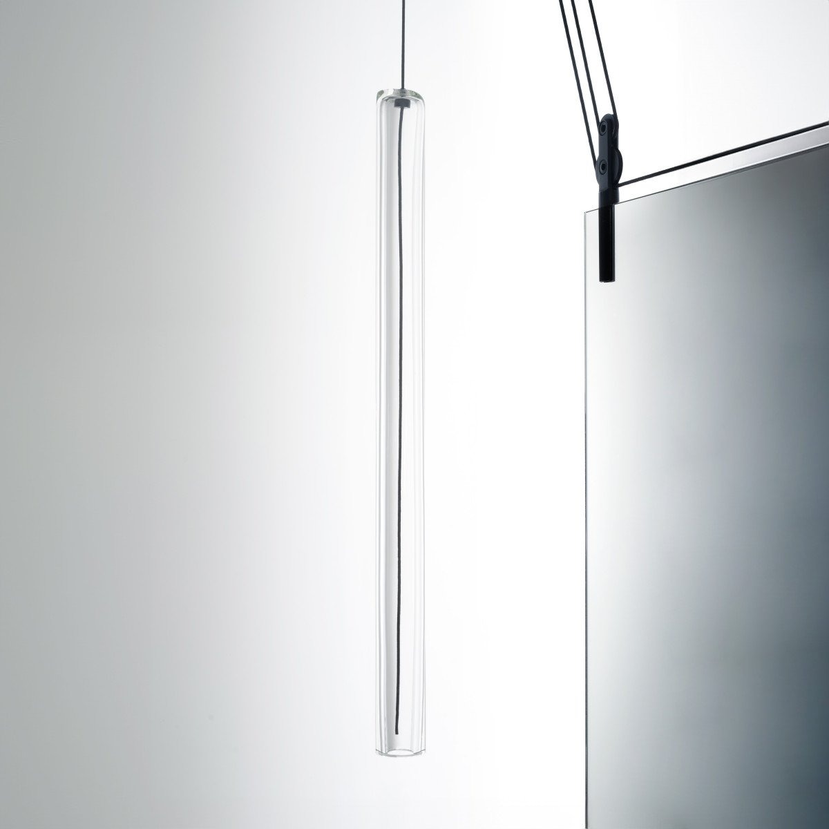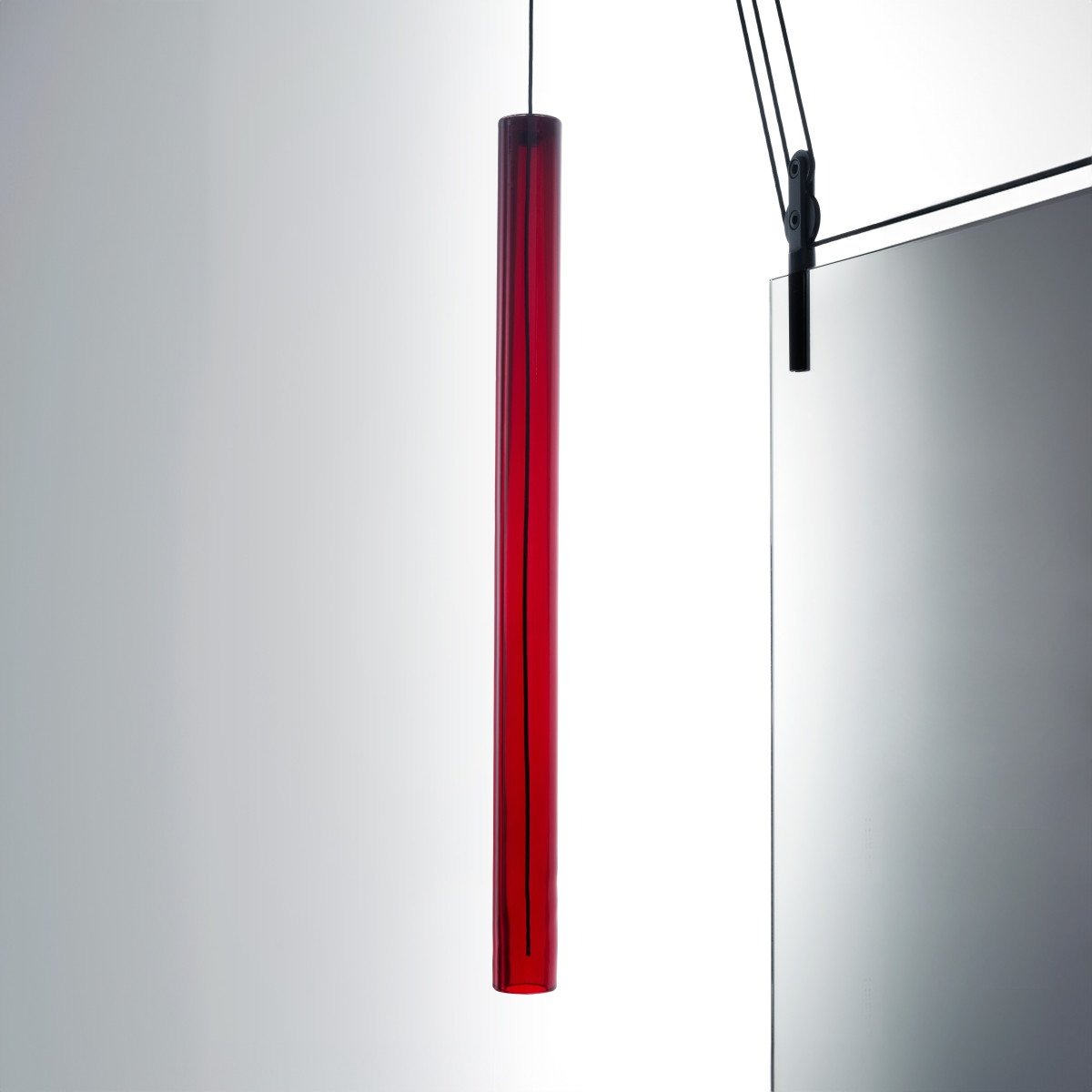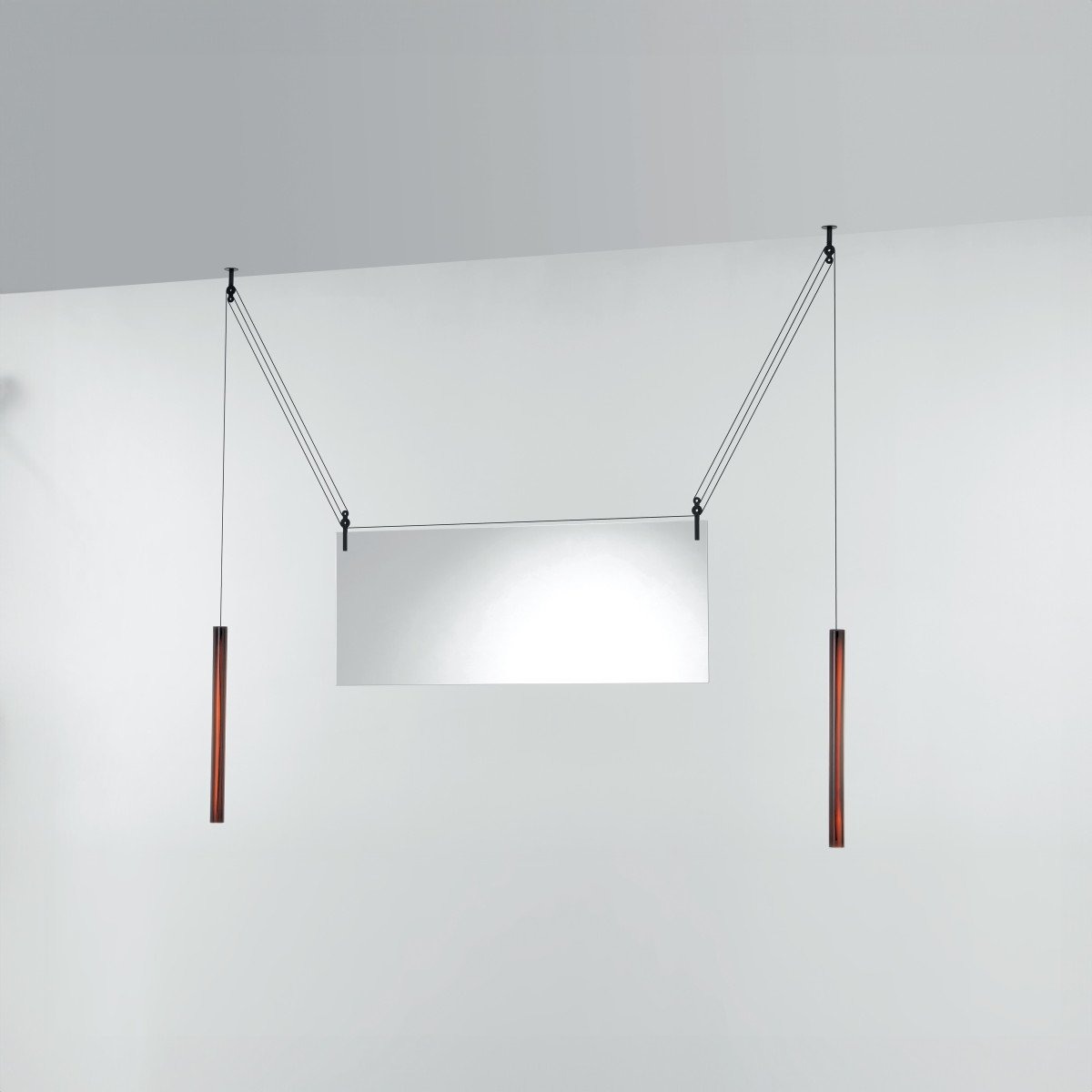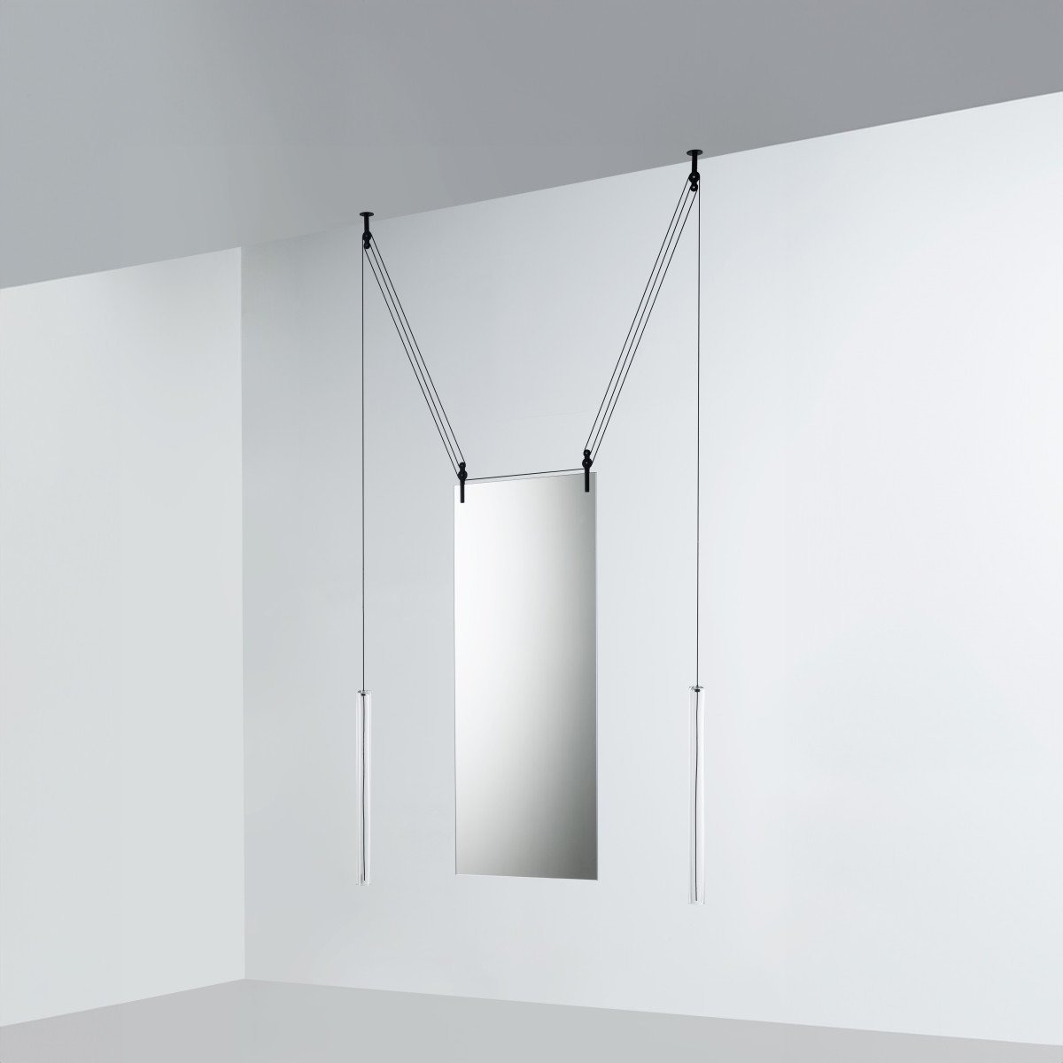 Двухстороннее зеркало, свисающее с потолка, доступно в трех вариантах исполнения, которые, благодаря системе противовесов, тросов и блоков, можно легко устанавливать вертикально. Противовесы, которые поднимаются и опускаются, уравновешивая движение зеркала, представляют собой цилиндры из красного или нейтрального выдувного стекла. Тросы и шкивы выполнены из черного алюминия. Благодаря двусторонней форме это зеркало идеально подходит для подвешивания не только у стены, но и в центре помещения в качестве разделительного и/или экранирующего элемента.