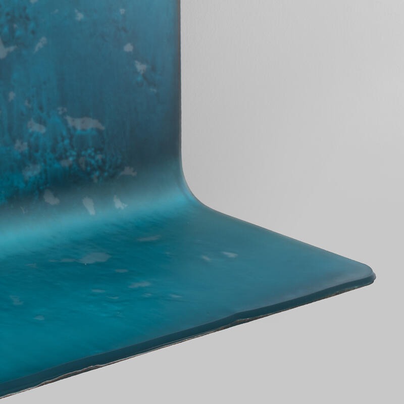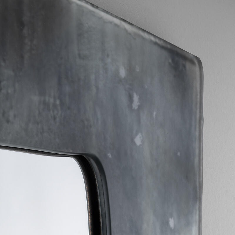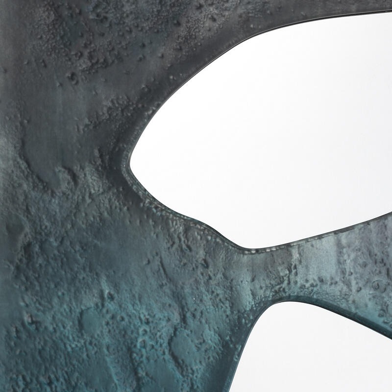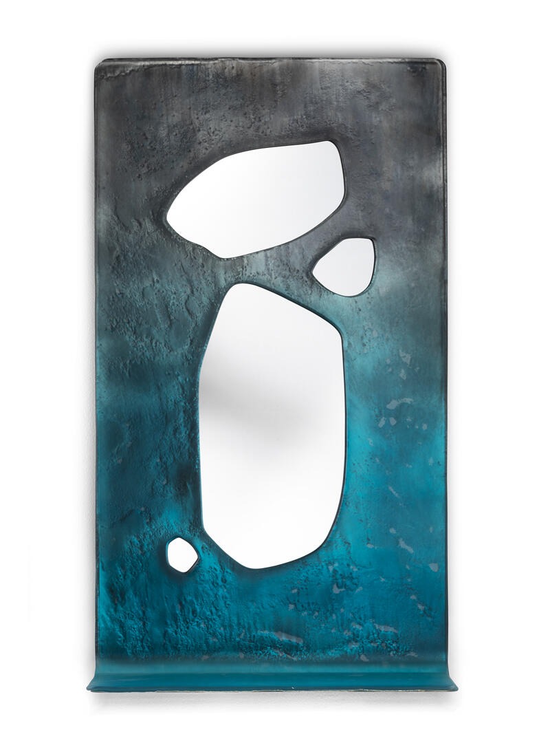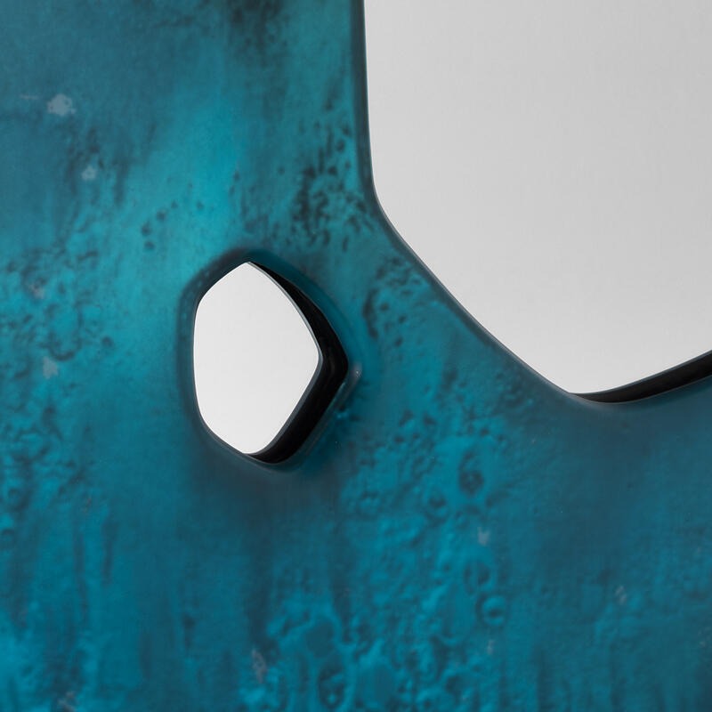 Зеркало-консоль из двухслойного изогнутого жаропрочного стекла с неровными краями. Все они декорированы в различных цветах — от аквамаринового до прозрачного, покрыты матовым лаком и посеребрены под старину.
