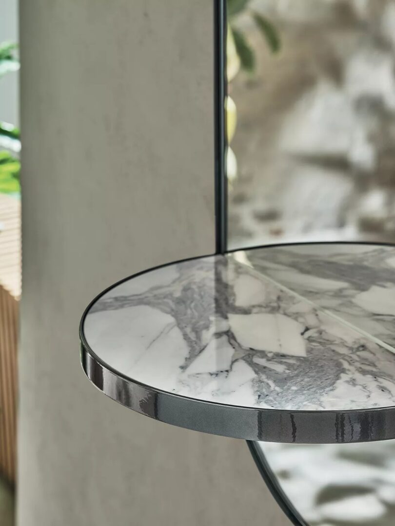 зеркало с полкой и структурой из лакированной стали.