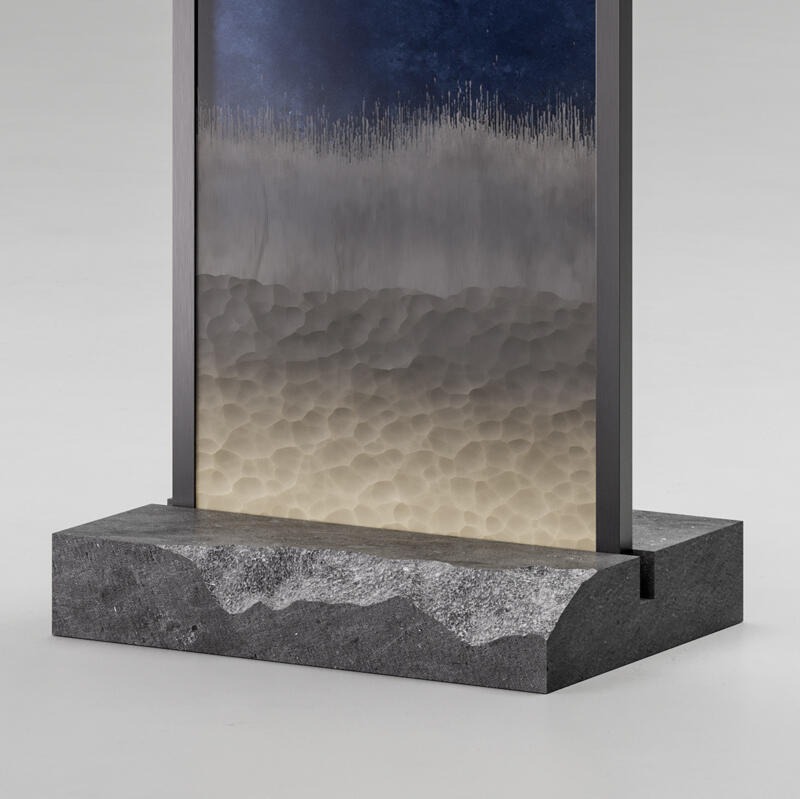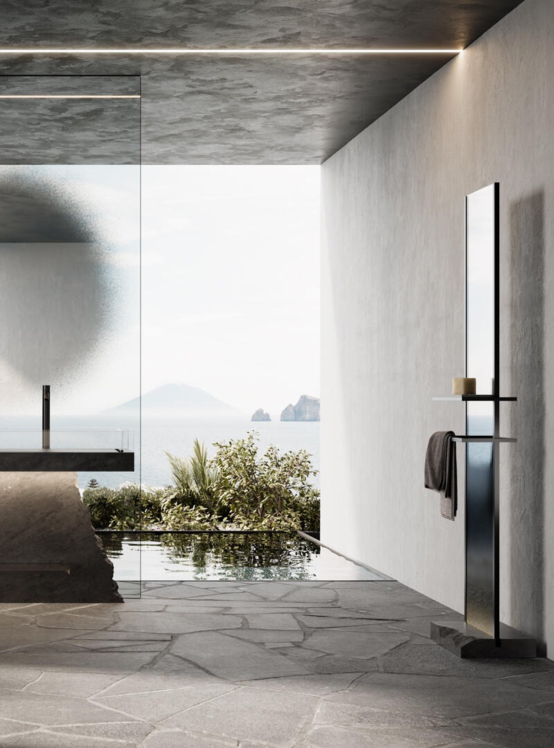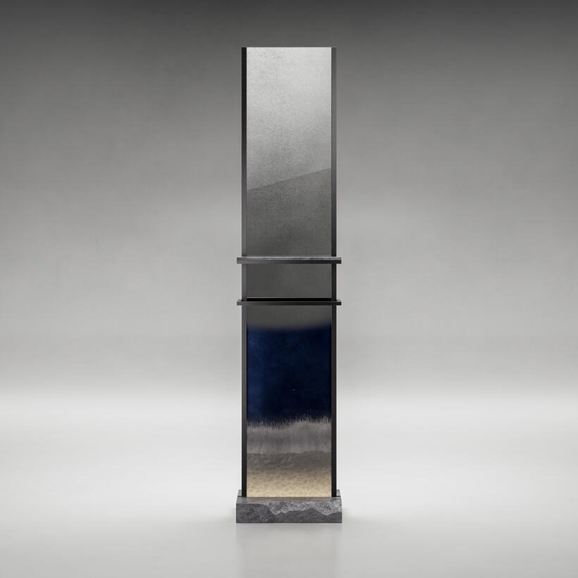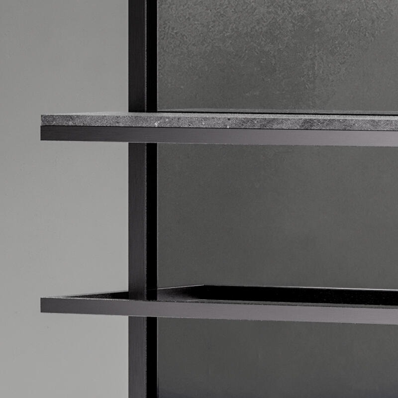 Металлическая конструкция с матовым черным никелевым покрытием. Основание и полка из базальтового мрамора.