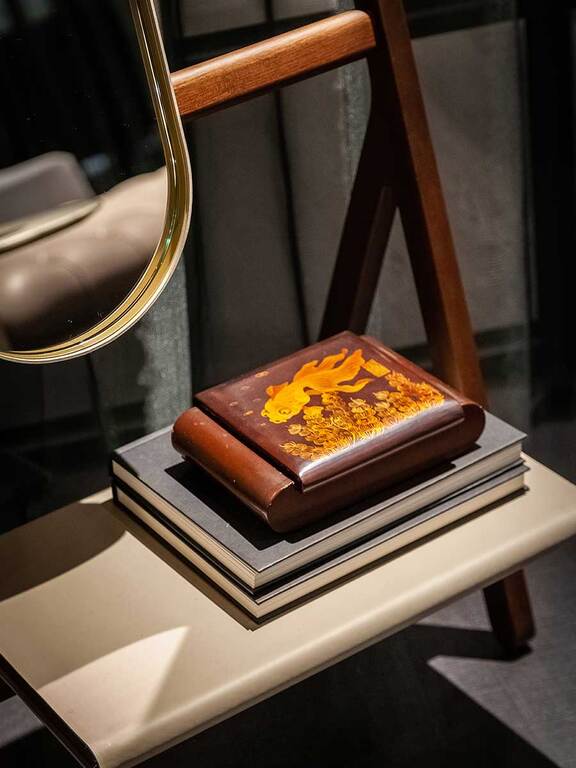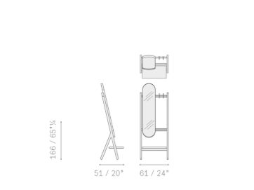 Зеркала Ren, разработанные для придания дому сдержанного и комфортного стиля, доступны в виде круглого зеркала (Ø 430 мм) или овального зеркала (280 x 1200 мм), также отдельно, и в настольном исполнении (Ø 310 мм). Они имеют латунную раму, обтянутую кожей Saddle Extra, а задняя панель выполнена из березовой фанеры со шпоном грецкого ореха Canaletto. Настольное зеркало состоит из круглого зеркала, закрепленного на несущей конструкции с помощью стального крючка из матовой стали с латунной отделкой. Отдельно стоящая зеркальная вешалка для одежды состоит из овального зеркала, низкой полки и двух крючков для развешивания одежды. Настенная зеркальная вешалка для одежды состоит из бруска орехового дерева Canaletto, к которому прикреплены круглое зеркало, круглый лоток для ключей и два крючка для развешивания одежды (система настенного крепления в комплект не входит). Туалетный столик состоит из круглого зеркала, овального лотка для ключей и столешницы со вторым встроенным отделением с поднимающейся крышкой из кожи Saddle Extra и латунной ручкой в форме кольца.
